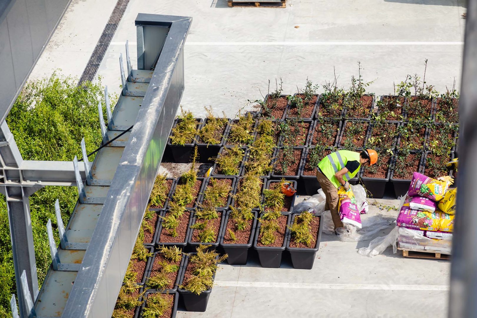 Per la costruzione dell’hub sono stati preventivamente demoliti gli edifici esistenti e, grazie al recupero di 50.000 metri cubi di detriti derivanti dalla demolizione (interamente riutilizzati per il riempimento degli scavi di fondazione), lo sviluppo non ha avuto alcun impatto sui terreni agricoli circostanti.
