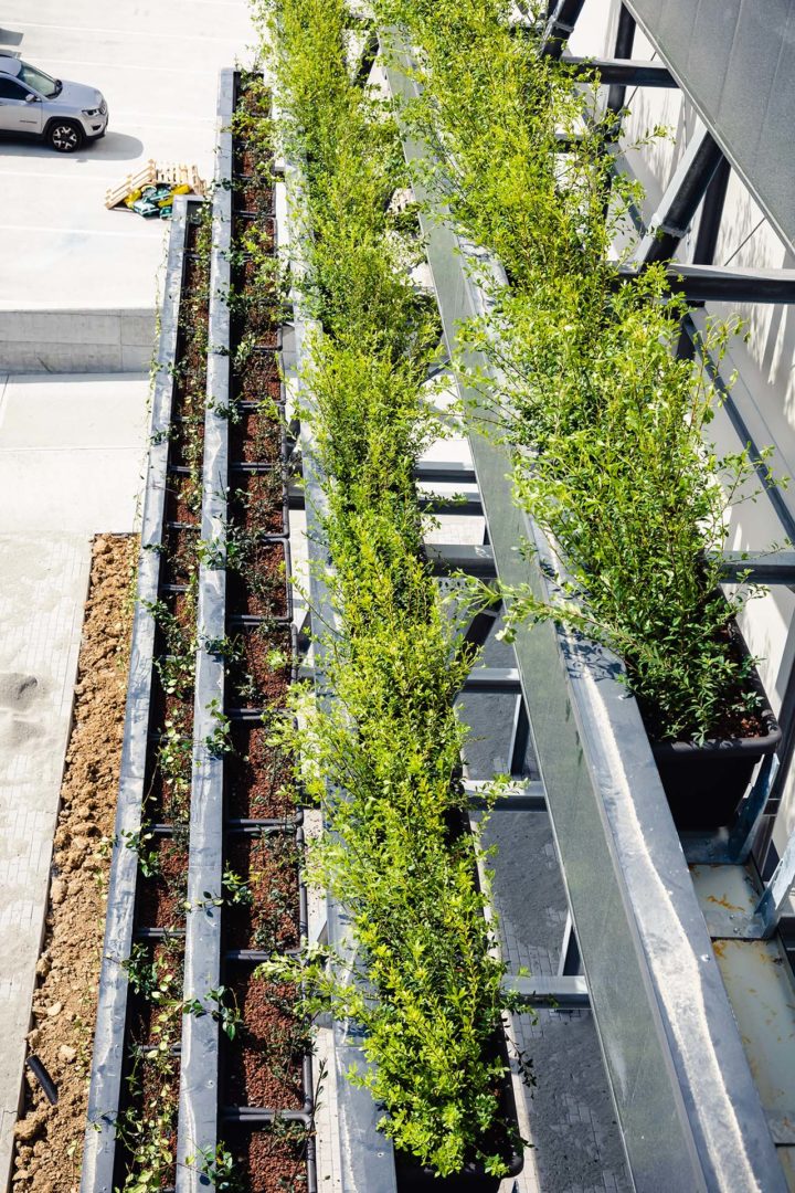 Il green wall dell’edificio, la parete verde composta da arbusti e piante di medie dimensioni, ha avuto l’obiettivo di compensare le emissioni di CO2generate dalle attività insediate, oltre a rendere la percezione visiva delle facciate più gradevole rispetto alla sola struttura geometrica.