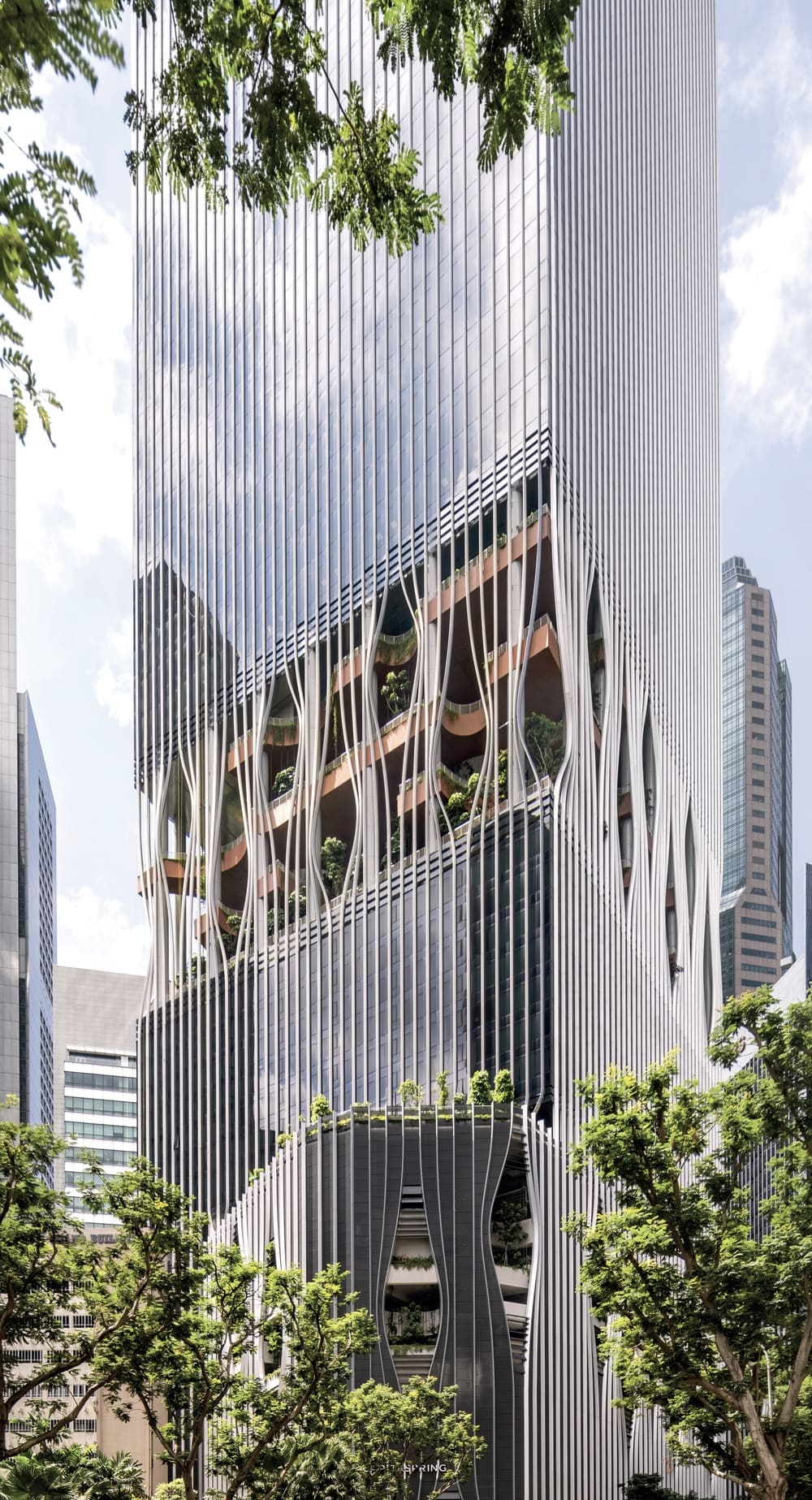 Questi elementi, che da lontano appaiono come fili verticali, determinano l’immagine di Capitaspring. Correndo a distanze regolari dalla base alla sommità dell’edificio, danno uniformità alla facciata. Tuttavia, in alcune zone specifiche, si allargano e restringono come sotto l’effetto di forze orizzontali che ne determinano una sorta di sfilacciamento. Dai vuoti che si generano, fanno capolino le piante della Green Oasis: uno spazio tra le residenze e gli uffici sviluppato su quattro livelli e adibito a giardino verticale dove poter incontrarsi e praticare attività all’aria aperta.