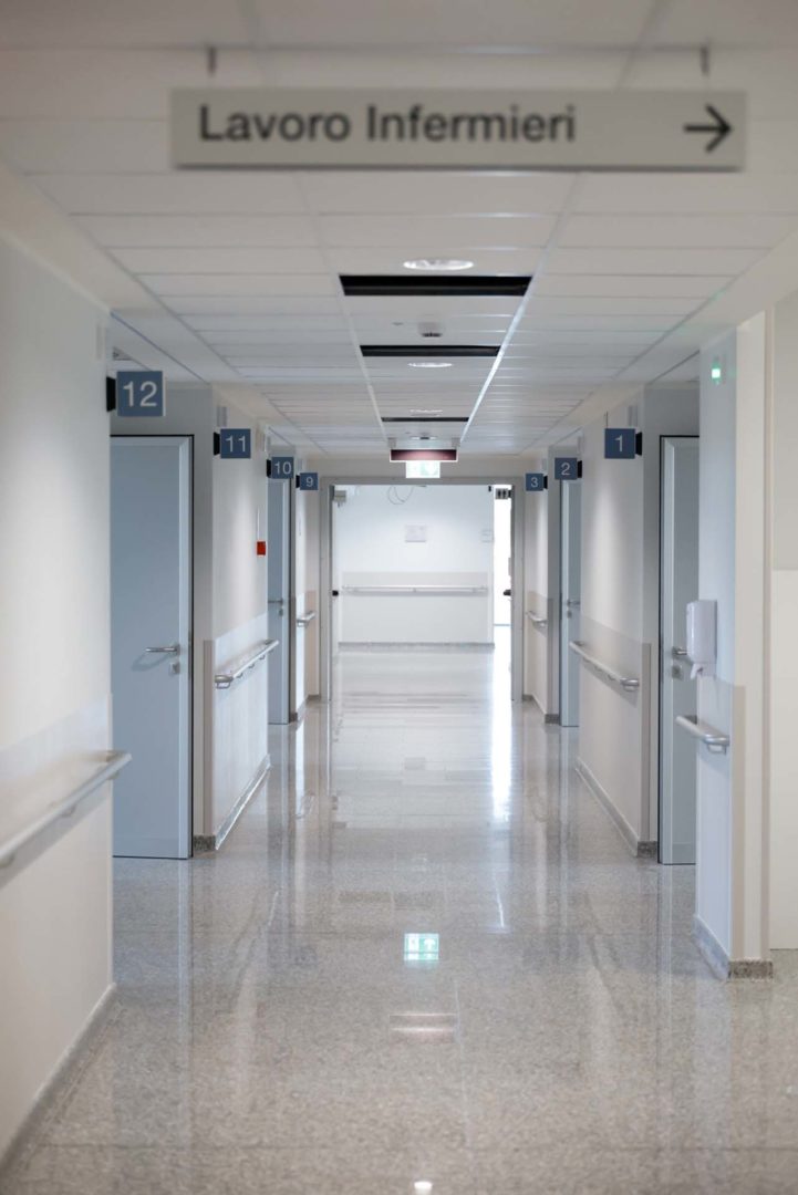 Il nuovo edificio si sviluppa su tre livelli fuori terra, adiacente alla struttura esistente. Il piano terra ospita l’accoglienza, la diagnostica per immagini e il pronto soccorso, collegato direttamente al blocco operatorio (cinque sale Iso 5 e Iso 7) e alla terapia intensiva (quattro posti letto), situati ai piani superiori. Qui si trovano anche le degenze per day surgery, riabilitazione, geriatria e l’ospedale di comunità, per un totale di 165 posti letto ordinari.