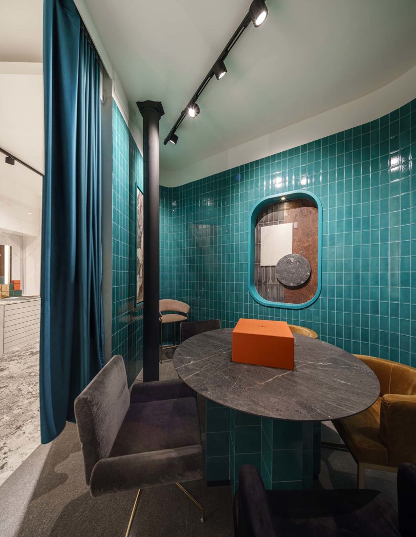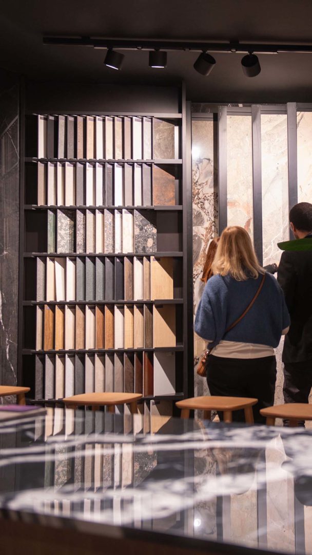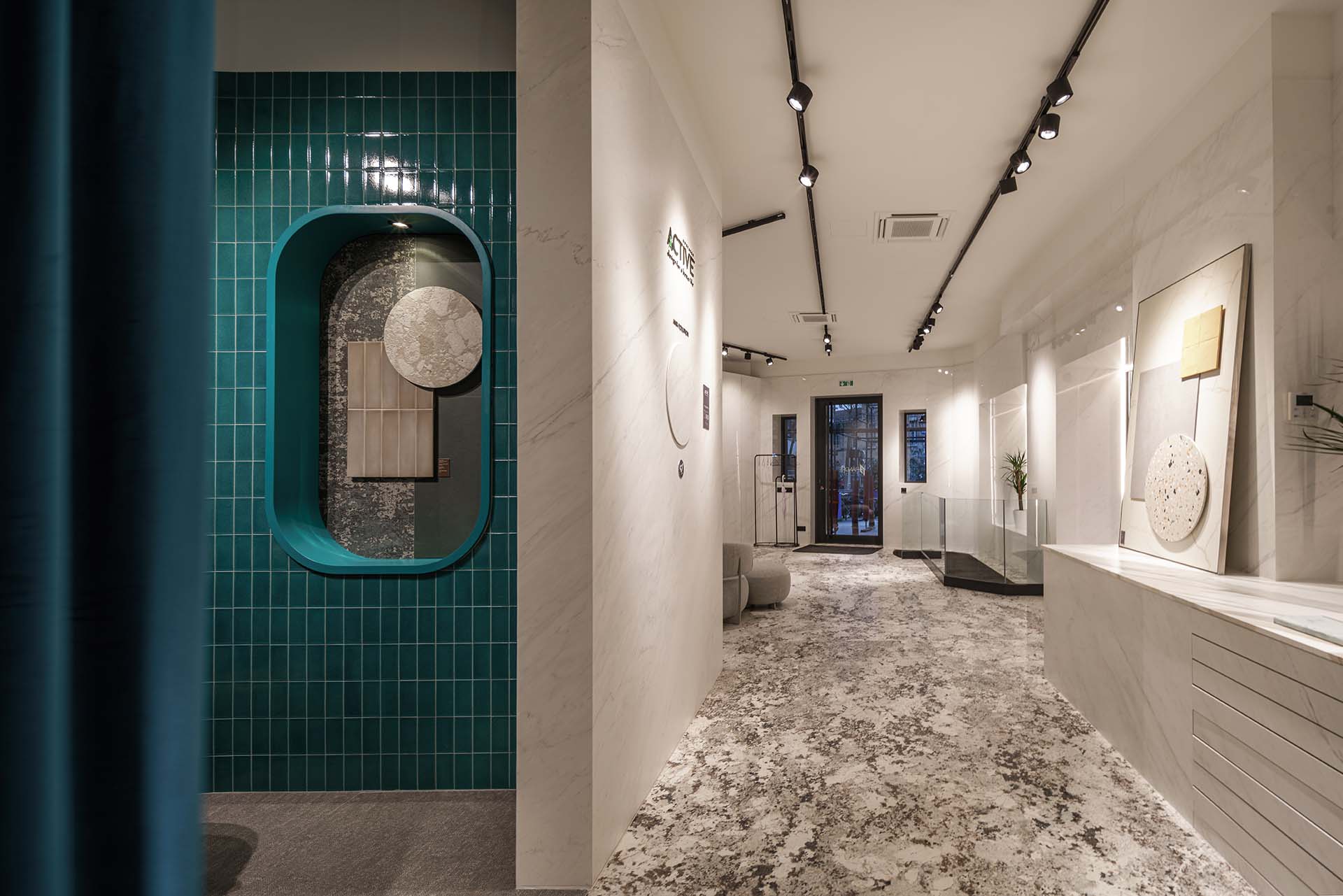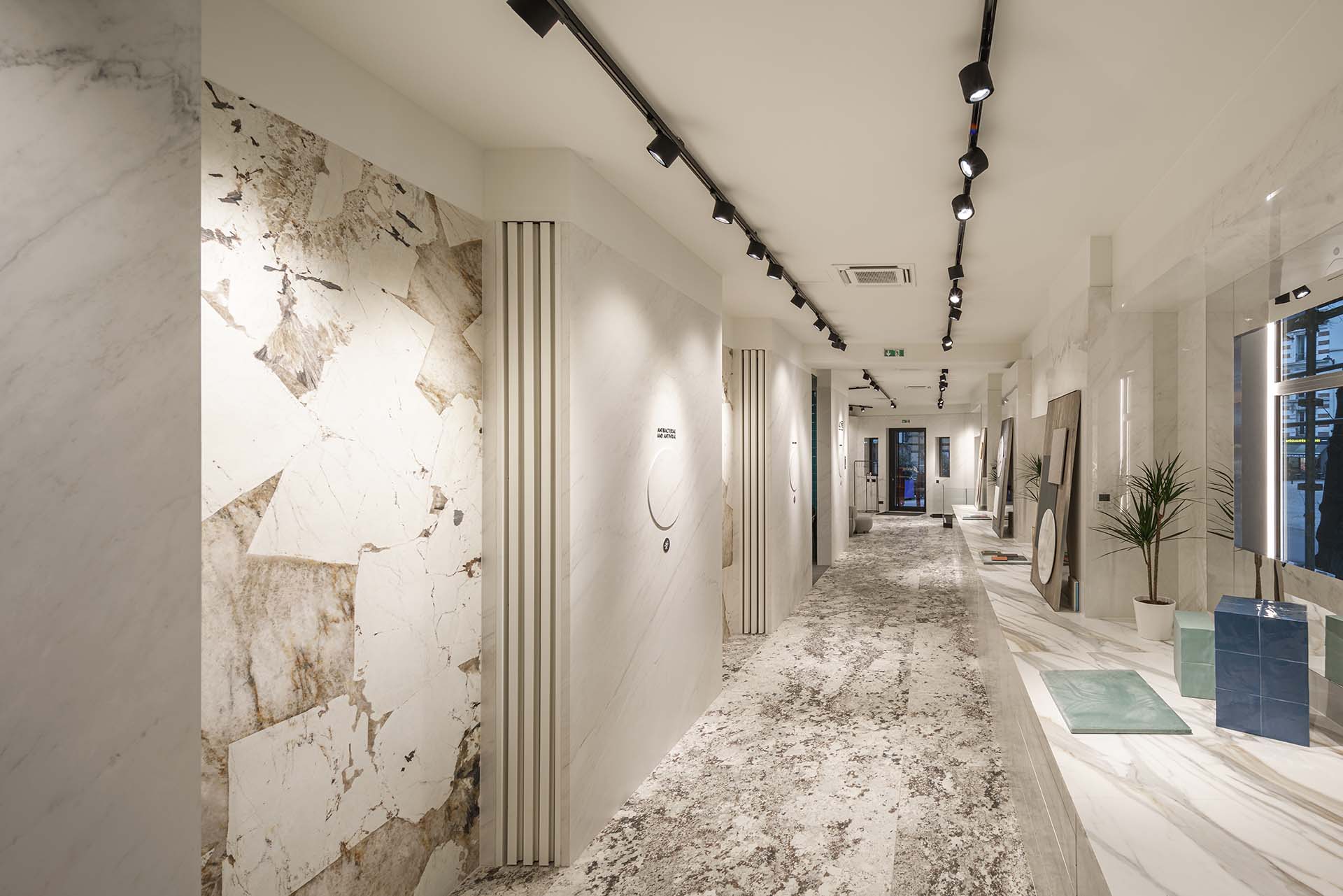 Lo showroom si presenta come una galleria in cui arte e tecnologia dialogano in modo armonico. Le superfici ceramiche – dalle Terrecotte di Bottega d’Arte alla Ceramica 4D, fino alle lastre Full Body – testimoniano la raffinatezza estetica e la profondità della ricerca materica.