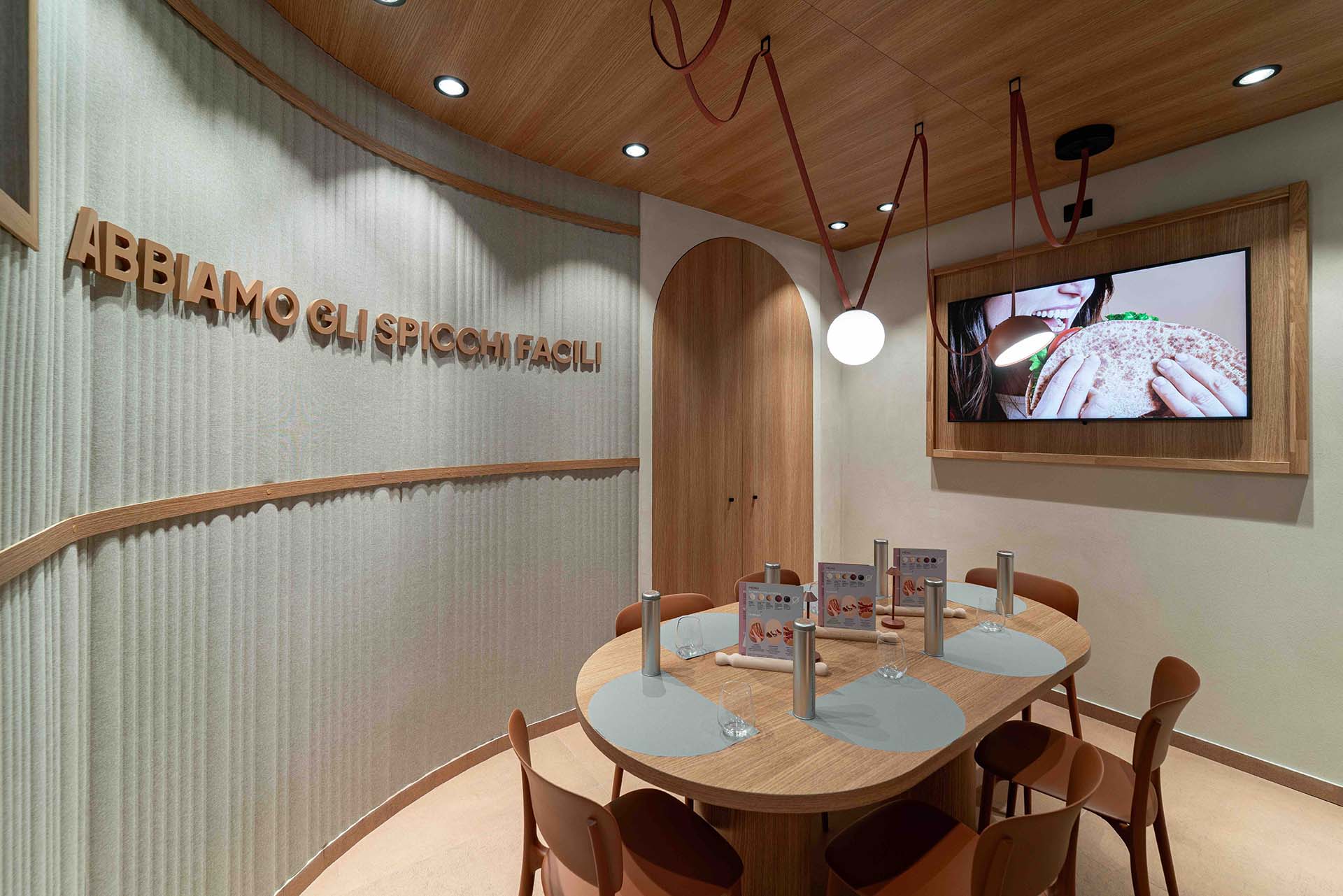 L’idea ci è venuta dal nome Tondarella: il cerchio ha ispirato gli elementi e l’identità del prodotto. Una forma morbida che ricorre in tutti gli arredi del locale, che volevamo richiamare anche nelle pannellature.