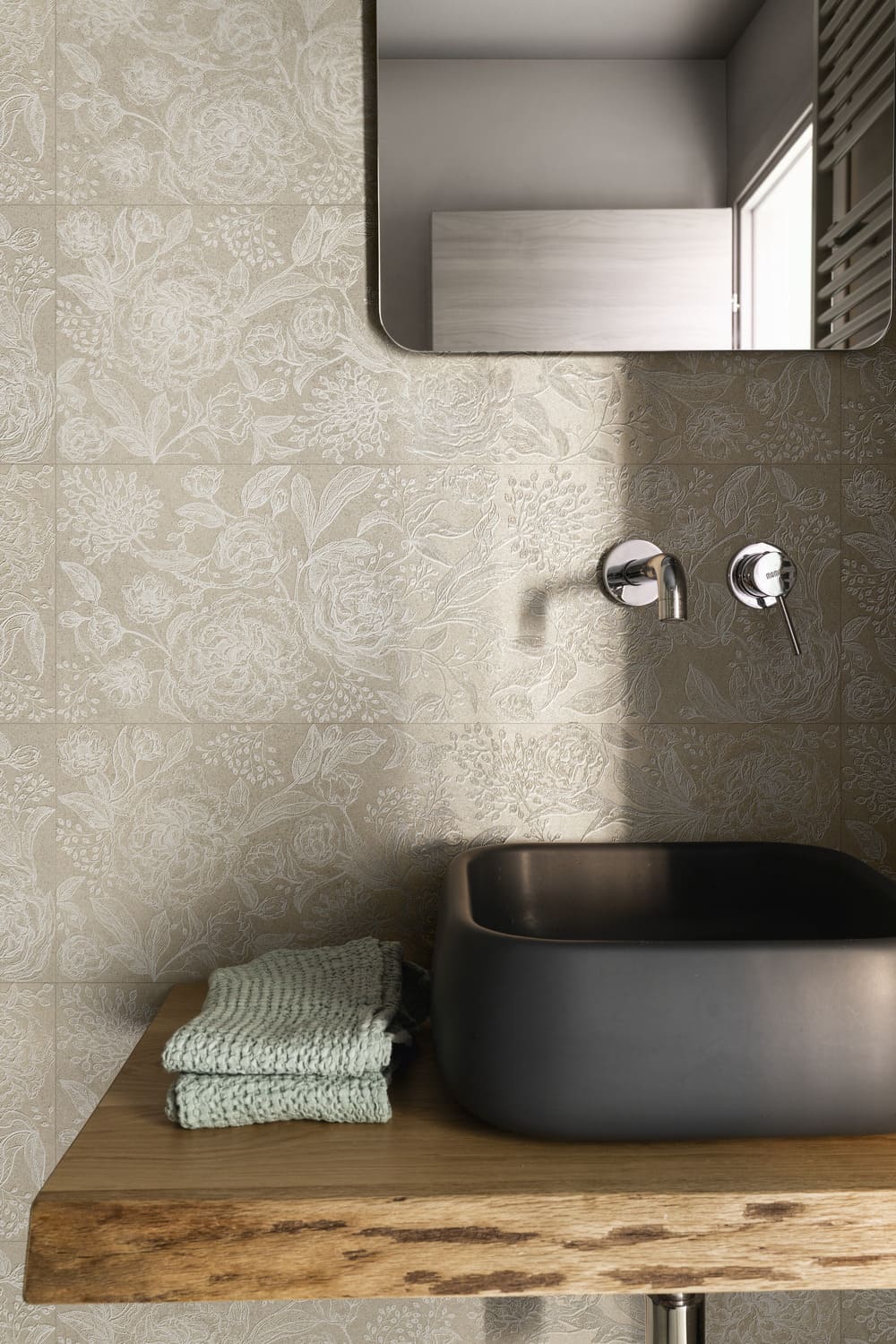 Tutti i decori Touch di Naturalia sono realizzati con una tecnica particolare che prevede l’aggiunta di graniglie lucide o matt su specifiche zone della grafica conferendo alla superficie profondità e senso materico. Tutti i decori “Touch” possono rivestire anche le pareti in doccia.