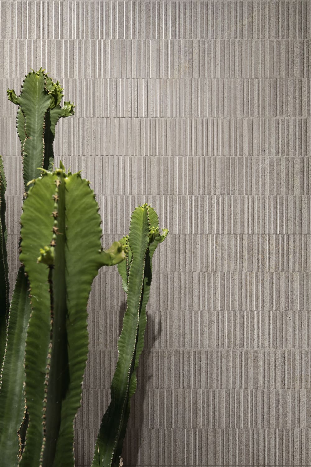 – 3D Codex simula un modulo a tre fasce orizzontali sfalsate, caratterizzato da un effetto bacchetta incisa multi-spessore, tipica delle lavorazioni della pietra che enfatizzano i chiaro-scuri;