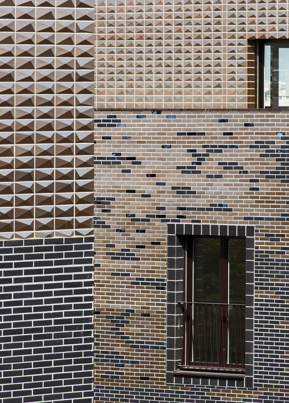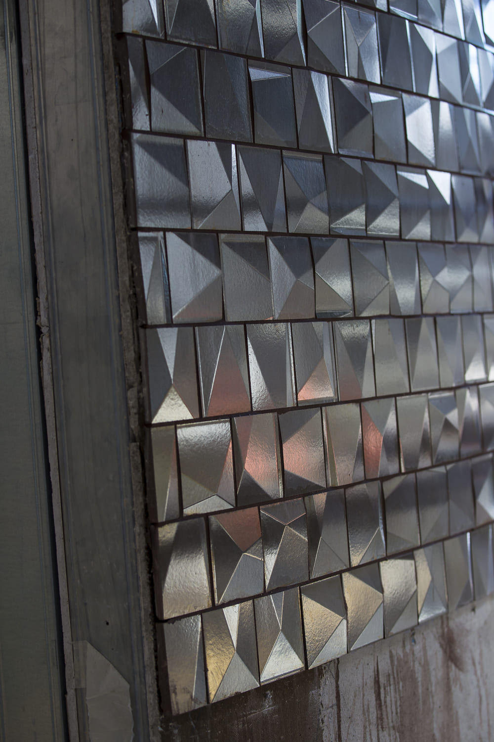 Il progetto è caratterizzato da una riaffermazione dell’uso della ceramica per la decorazione in facciata. Il rivestimento utilizzato per i 1.000 mq dell’involucro esterno è Diamante R20 di Casalgrande Padana, nei colori Oro e Bianco e nel formato 10×20 cm. Questa esclusiva tipologia di piastrelle in gres porcellanato smaltato, plasmata tridimensionalmente nel suo spessore, cambia in funzione della luce, adattando i suoi colori in base alle stagioni e alle ore del giorno.