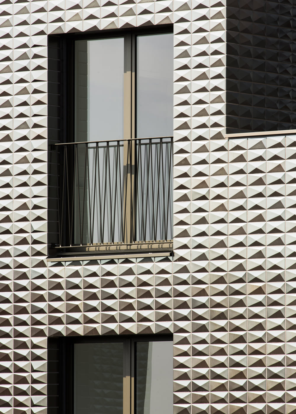 In questo caso la piastrella in gres porcellanato Diamante Boa è stata utilizzata per rivestire i coni verticali che emergono dall’edificio.