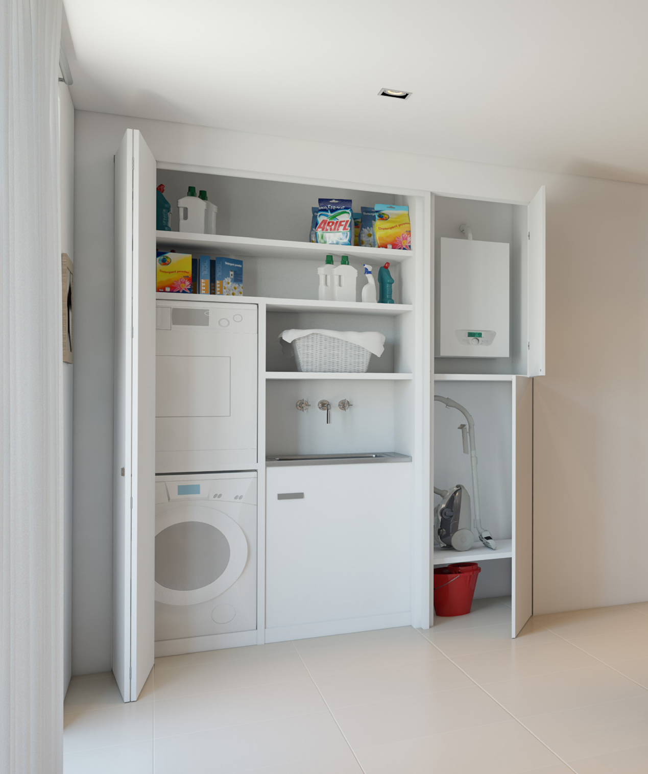 Detersivi, cesti per i panni, elettrodomestici, lavatoi e catini possono generare notevole disordine, se non ben organizzati con mobili dedicati. La soluzione ideale sarebbe dedicare una piccola stanza alla zona lavanderia, ma qualora ciò non fosse possibile, Sistemi RasoParete permette di organizzare in modo equilibrato gli spazi, per nascondere il piccolo angolo domestico alla vista e salvaguardare il minimalismo e l’ordine dell’ambiente circostante.