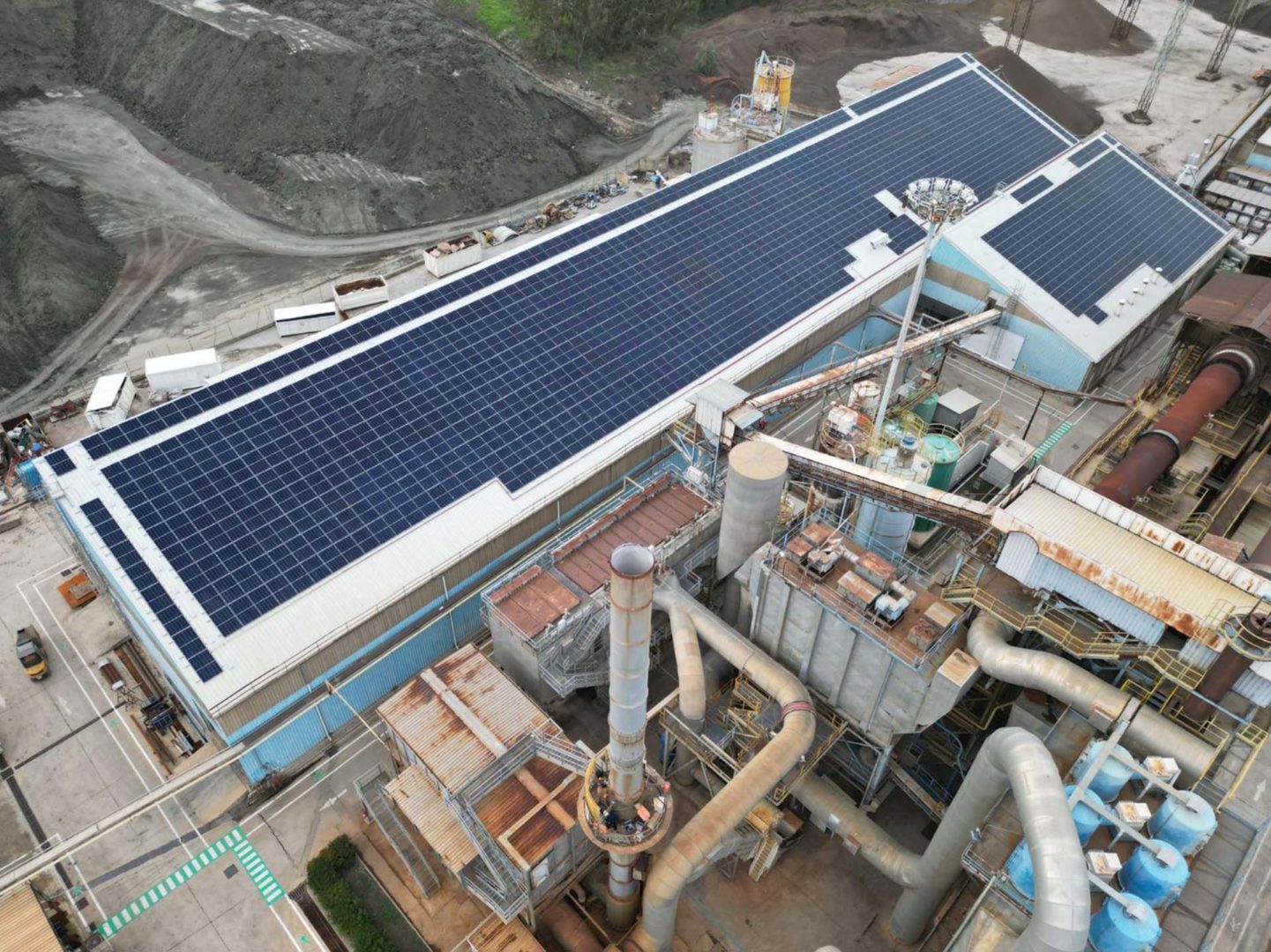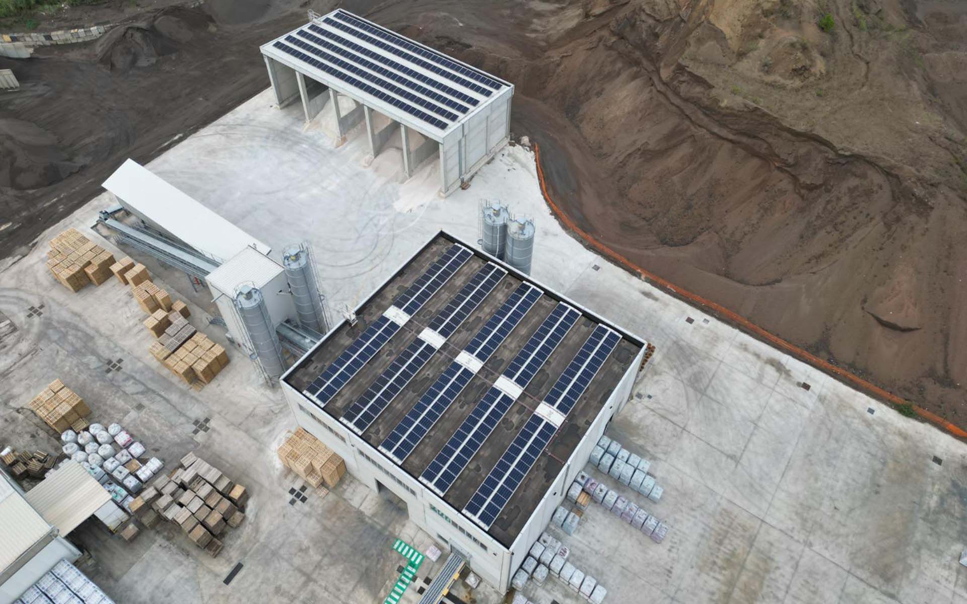 Il sistema si distribuisce su tre tetti principali: il capannone esistente, dotato di una nuova copertura; la struttura dedicata ai predosati; e il capannone di stoccaggio inerti.