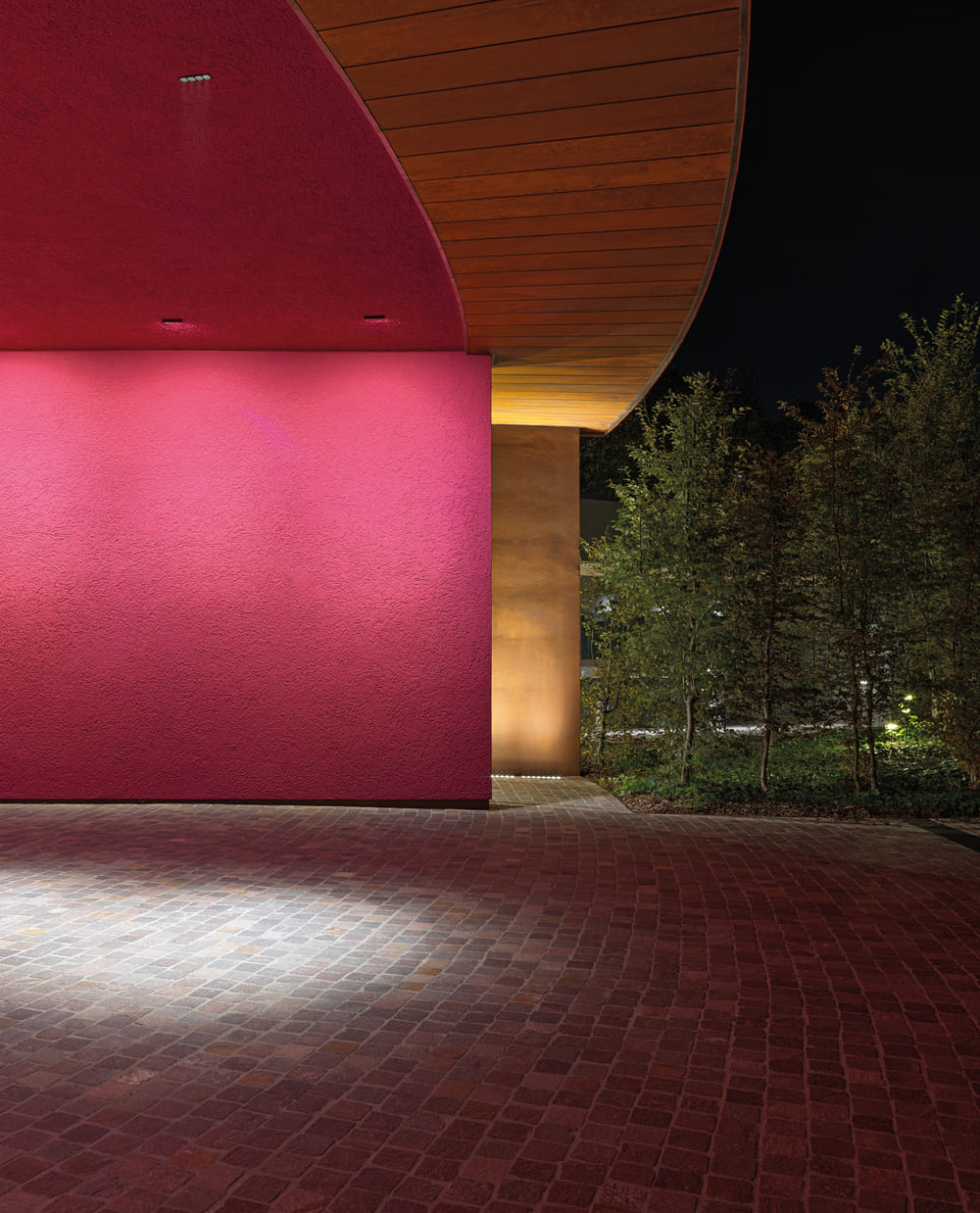 Le vetrate a tutta altezza costituiscono una cortina quasi diafana a delimitare il limite interno-esterno senza interrompere la vista; la monumentale apertura verso il parco e le sue sculture amplifica la percezione di un orizzonte infinito, sull’asse di precisi coni ottici. A seconda dell’ora e delle stagioni, la luce naturale cambia in maniera significativa entrando dalle porzioni trasparenti scandite dai portali lignei, talvolta illuminando e talora proiettando ombre.