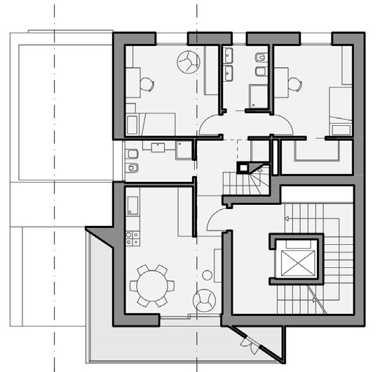 Il risultato armonico cercato dai progettisti, con l’inserimento del nuovo corpo di fabbrica, avviene attraverso la scrupolosa ripresa delle linee di gronda dei fabbricati adiacenti e dei fili delle facciate. In una situazione determinata da vincoli molto forti, LPzR architetti associati non perdono l’occasione per giocare con la variazione tipologica e il disegno dei fronti, in questo caso strettamente connessi. I prospetti sono definiti da tre elementi: le cornici, le aperture e le masse. La partitura regolare di cornici bianche reinterpreta in chiave contemporanea un tratto tipico dell’edilizia storica e risulta enfatizzata dall’uso di frame metallici in rilievo che genera un gioco di chiaroscuro.