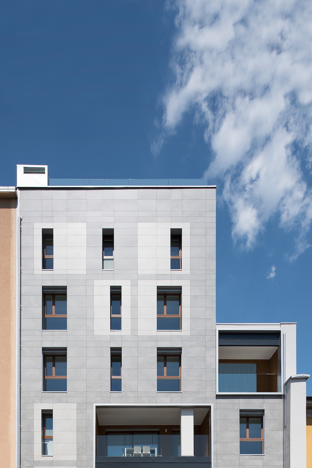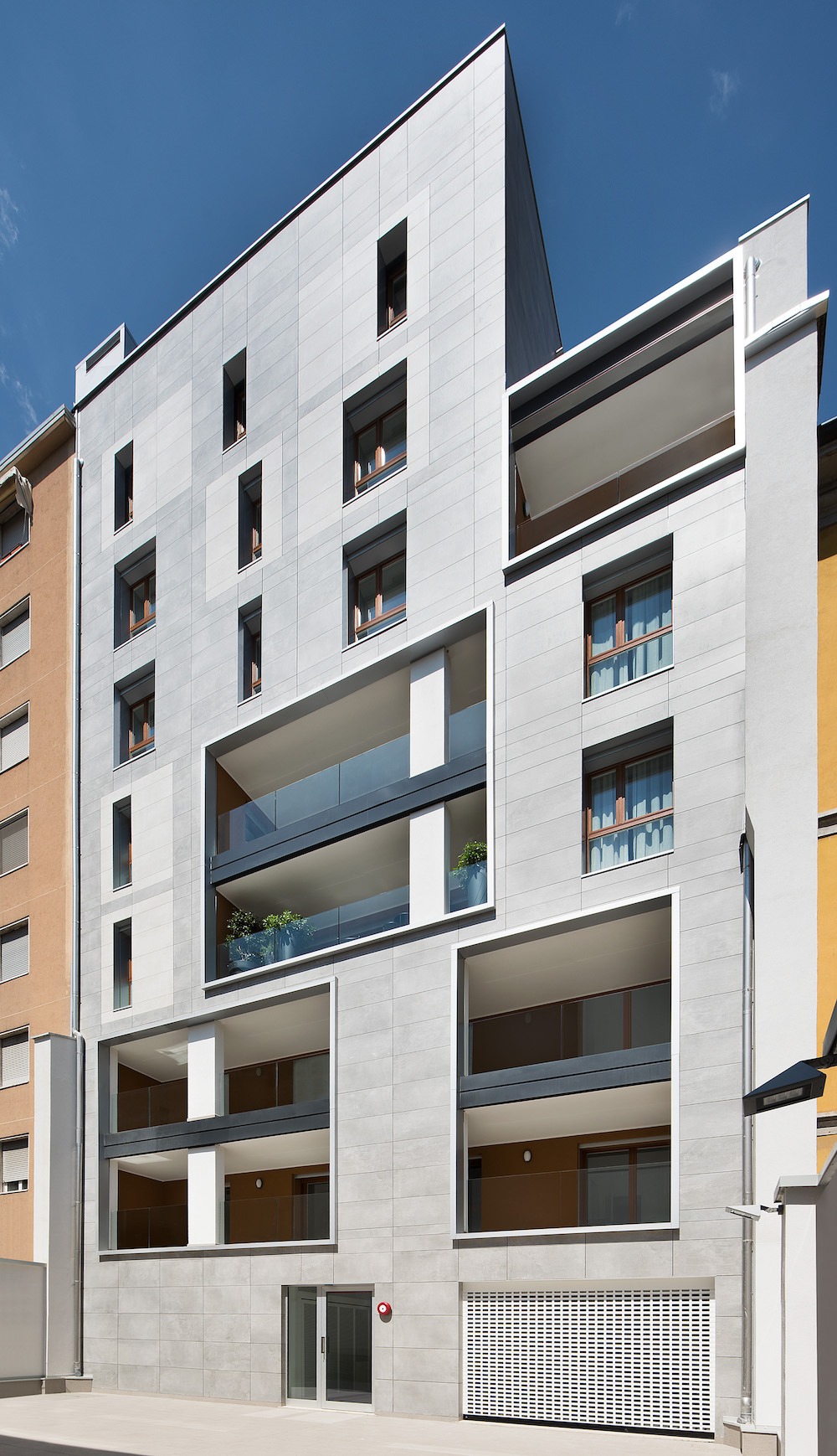 Un nuovo edificio residenziale si colloca nei pressi del polmone verde di Parco Sempione, in uno stretto spazio contenuto nello spessore della cortina edilizia milanese. L’operazione di ricucitura urbana è chiamata a raccordare due edifici estremamente eterogenei: un plesso scolastico di fine Ottocento, alto solo tre piani, e uno residenziale degli anni Sessanta sviluppato su otto piani. Il progetto assume quindi una posizione di mediazione sia sul piano spaziale-fisico, nel suo dover mettere a sistema due condizioni diverse come l’altezza, sia sul piano temporale storico, nel tessere relazioni formali con edifici collocati in passati diversi, espressi attraverso un peculiare lessico architettonico.