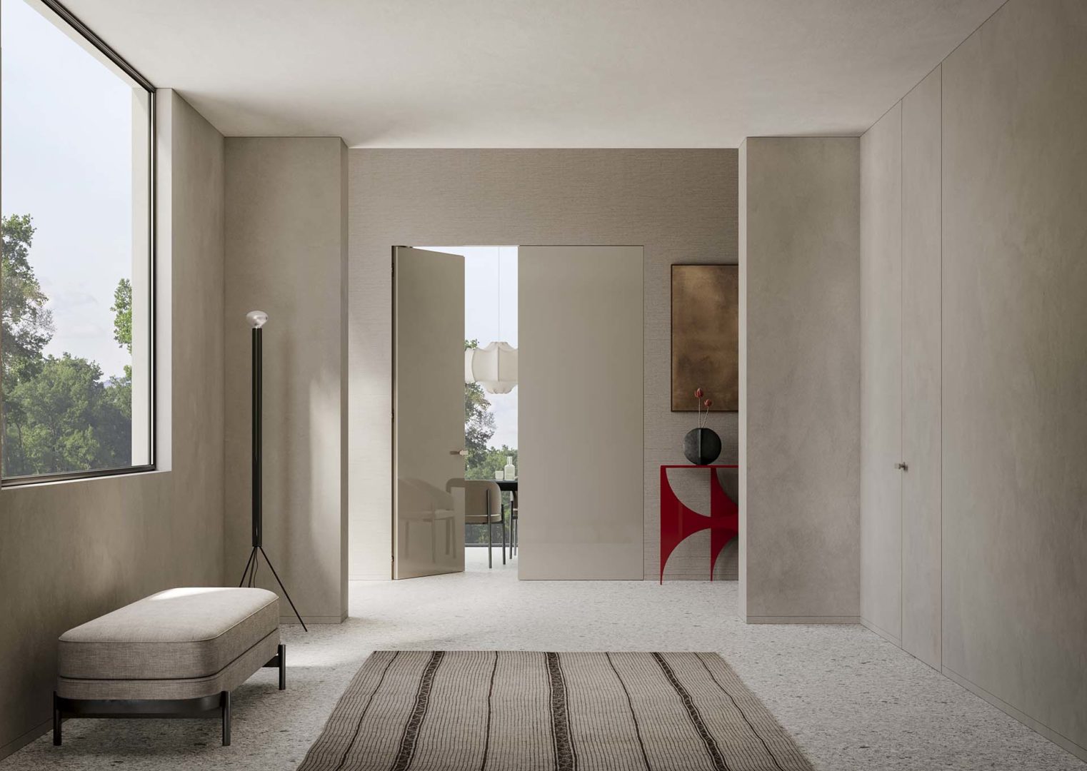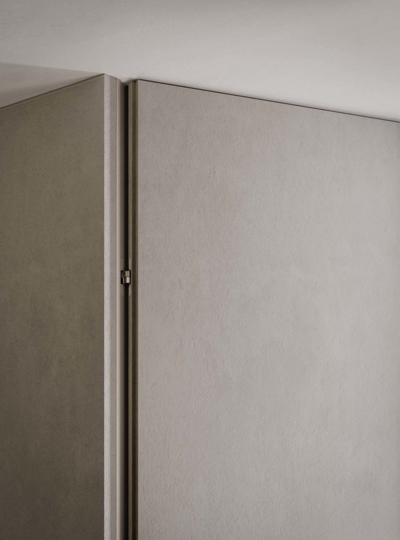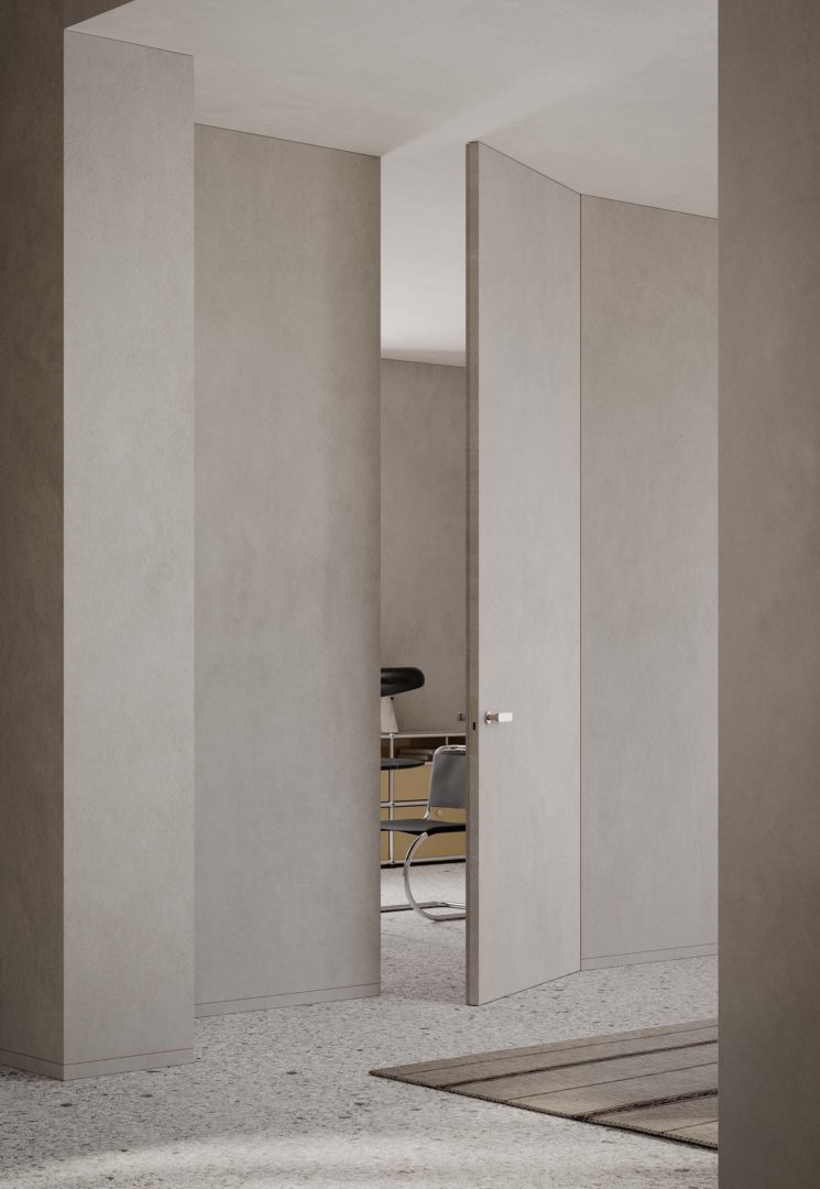 Grazie alle cerniere completamente a scomparsa, al forte spessore e allo stipite invisibile in alluminio, Rasomuro 55s è una porta di design in grado di integrarsi alla parete con mimetismo perfetto.