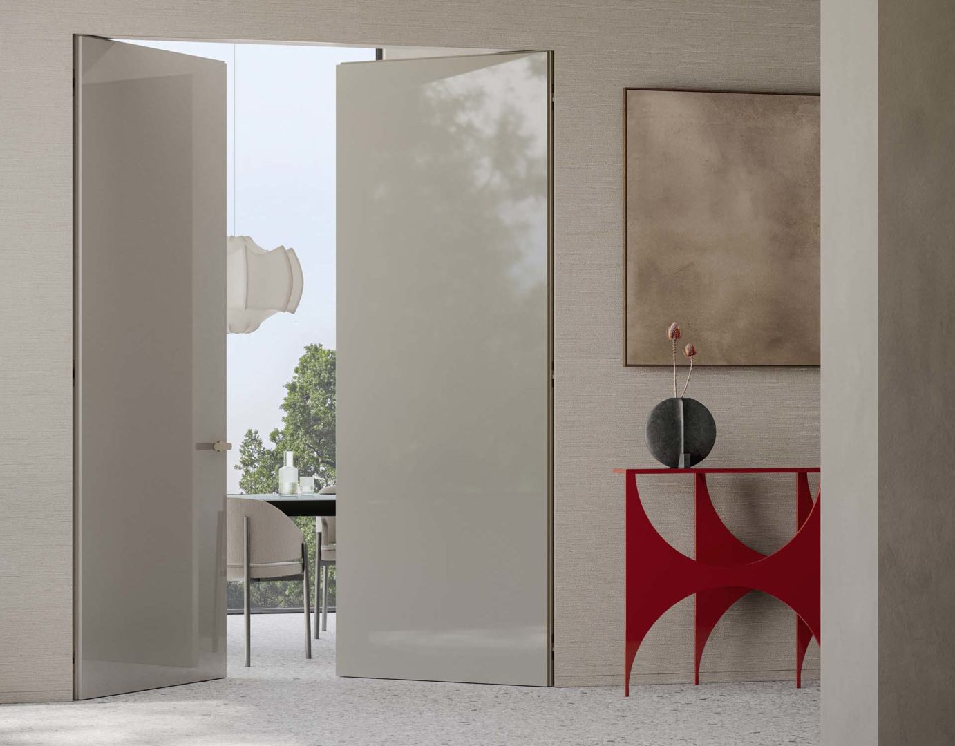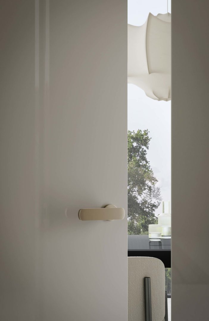 Perfettamente complanare e dotata di anta pivotante, Compass 55 ha l’aspetto di una quinta ampia e silenziosa, capace di mettere in comunicazione gli spazi con assoluta leggerezza.