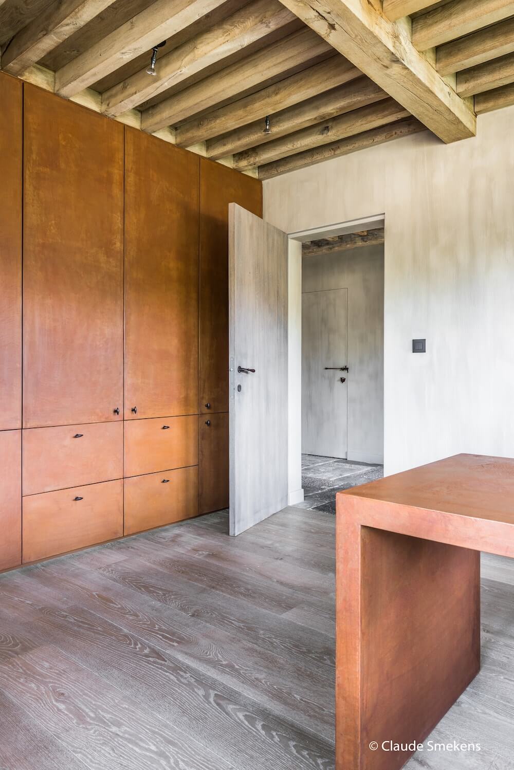 Utilizzato di solito in abitazioni moderne e spazi minimalisti e di design, il rivestimento Microtopping si inserisce con stile anche in interni più lussuosi e rustici tradizionali reinterpretati in chiave chic. Come questo cottage fiammingo, dove il pavimento in pietra, l’uso predominante di legno di recupero lasciato al grezzo, le travi a vista, l’arredo vintage dai toni neutri riportano a una dimensione rustica.