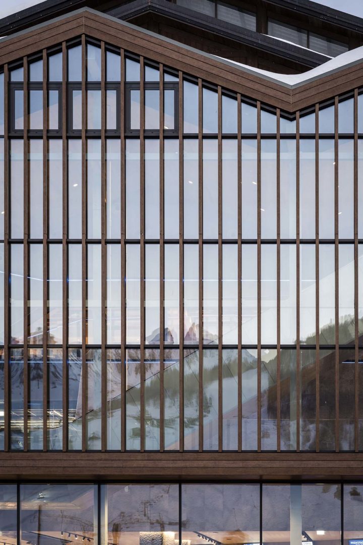 Le facciate vetrate a tutta altezza, realizzate da Pichler projects, garantiscono un apporto costante di luce naturale e un rapporto visivo diretto con il paesaggio alpino.