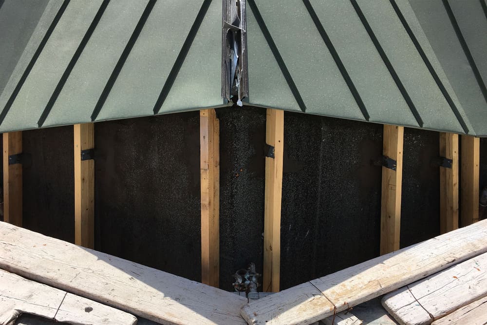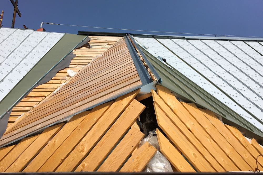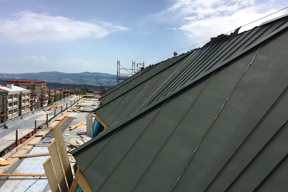 Per la nuova copertura è stato scelto lo zinco-titanio zintek che, unitamente al pacchetto di isolamento, ha contribuito a risolvere le problematiche presenti, incrementando le prestazioni termiche. Per la posa è stata scelta la tecnica dell’aggraffatura angolare, consigliata per pendenze maggiori di 25 gradi. Molta cura è stata riservata ai tagli delle singole lamiere in zinco-titanio, ognuna diversa dall’altra, e alle pieghe delle aggraffature di giunzione. Le particolari qualità dello zintek, la sua lavorabilità e adattabilità a forme architettoniche complesse, oltre alle caratteristiche prestazionali di tipo meccanico, si sono rivelate adatte per valorizzare anche la peculiare morfologia del tetto.