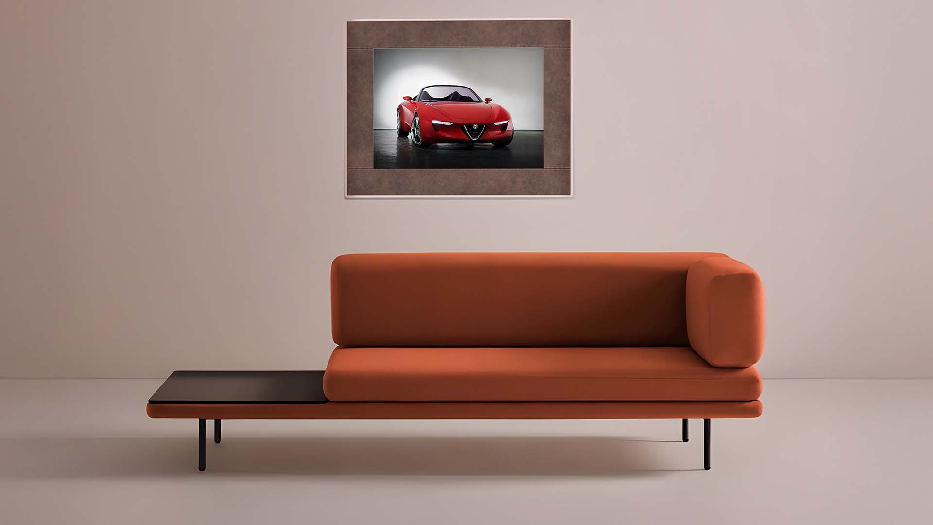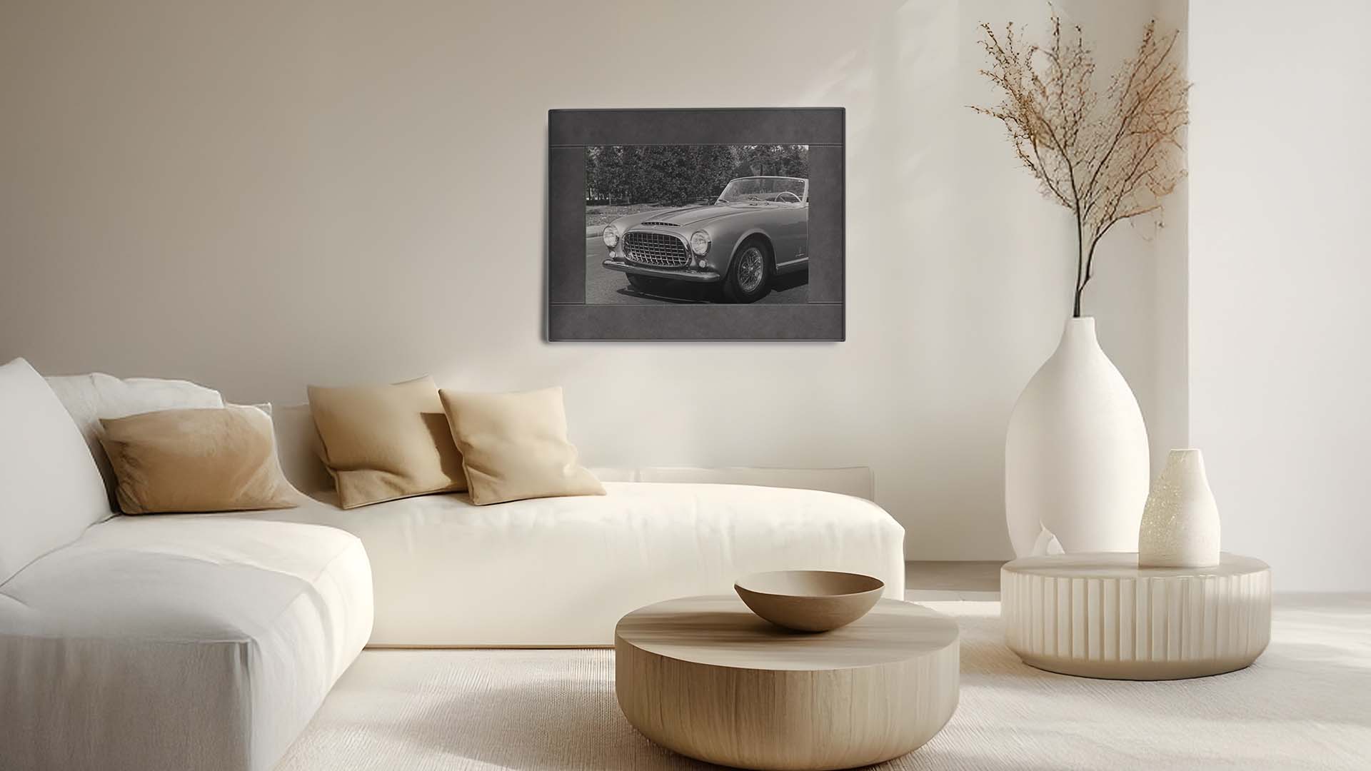La cornice rivestita in Alcantara, materiale iconico degli interni automobilistici di alta gamma, aggiunge una nota tattile e sofisticata.