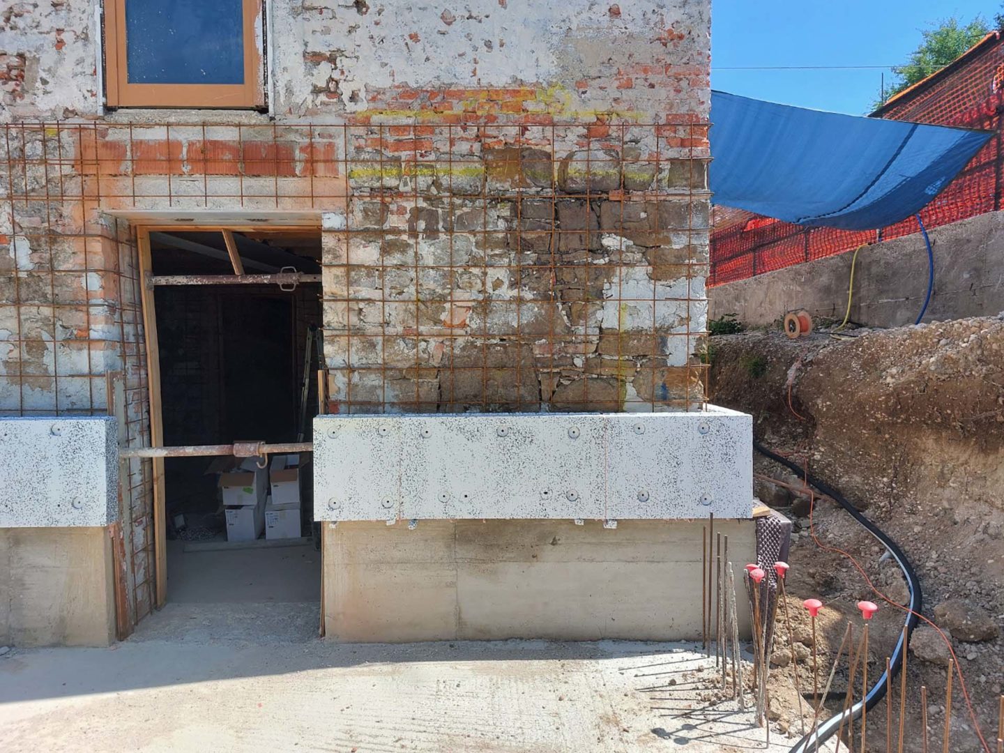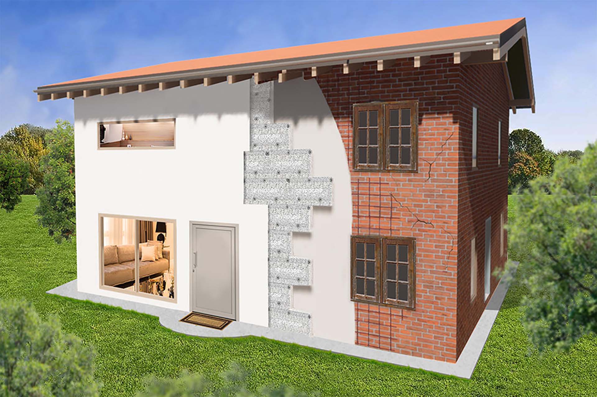 La soluzione prevede la realizzazione di un guscio antisismico, ottenuto mediante la costruzione di una parete in calcestruzzo armato termoisolata, collegata alla struttura portante esistente tramite ancoraggi meccanici.