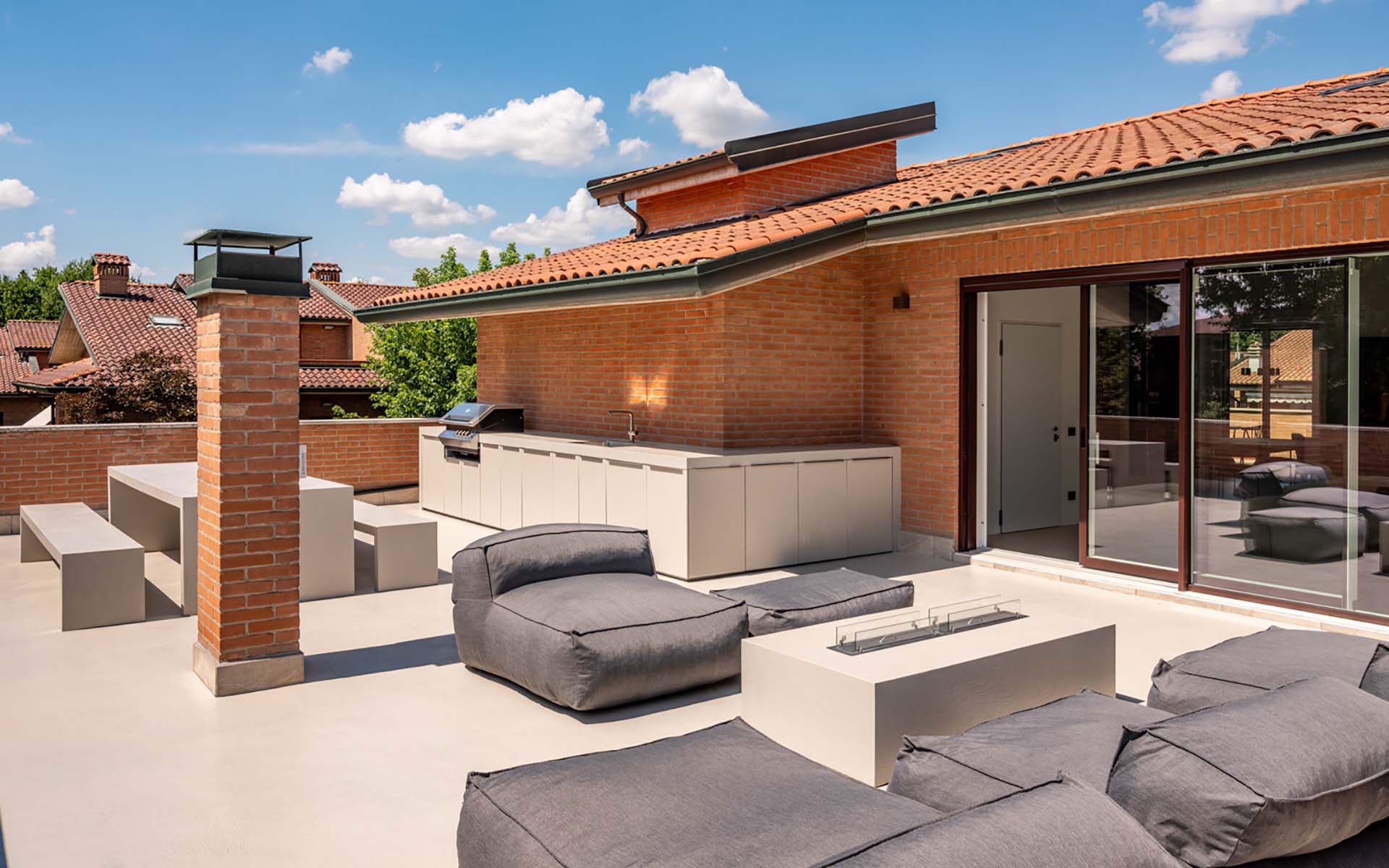 Il progetto si completa con una terrazza rivestita in cemento architettonico a basso spessore, arredata con volumi essenziali e pensata per essere vissuta in ogni stagione.