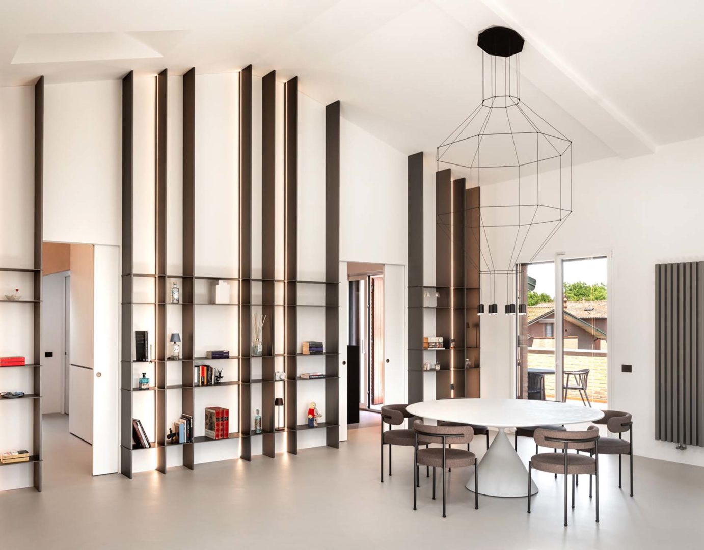 Elemento centrale del soggiorno è la grande libreria su misura, concepita non solo come contenitore ma come vero e proprio dispositivo architettonico.