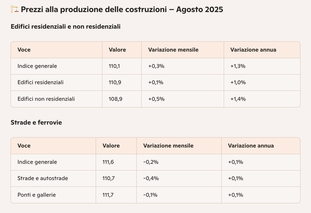 - Edifici residenziali e non residenziali: +0,3% su base mensile, +1,3% su base annua