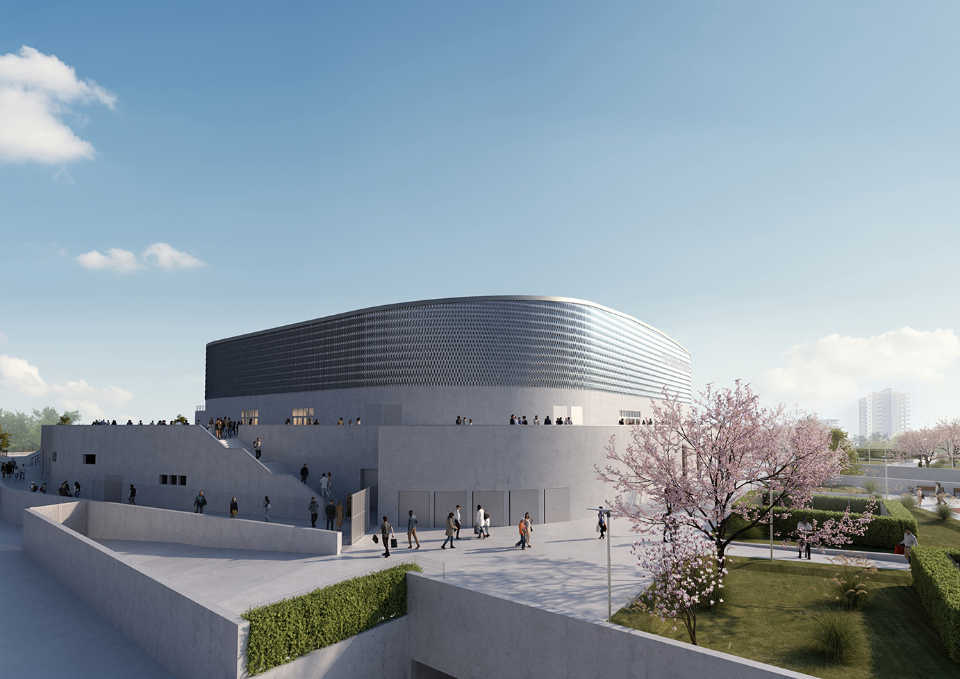La struttura poggerà su un podio architettonico che fungerà da punto di connessione con il tessuto urbano circostante.