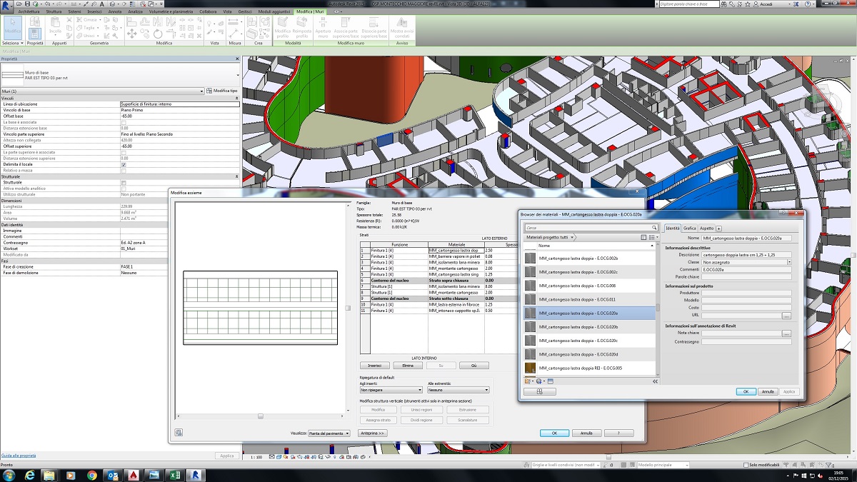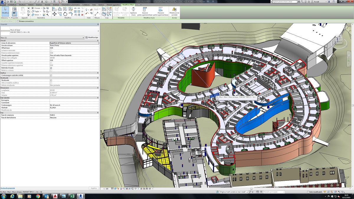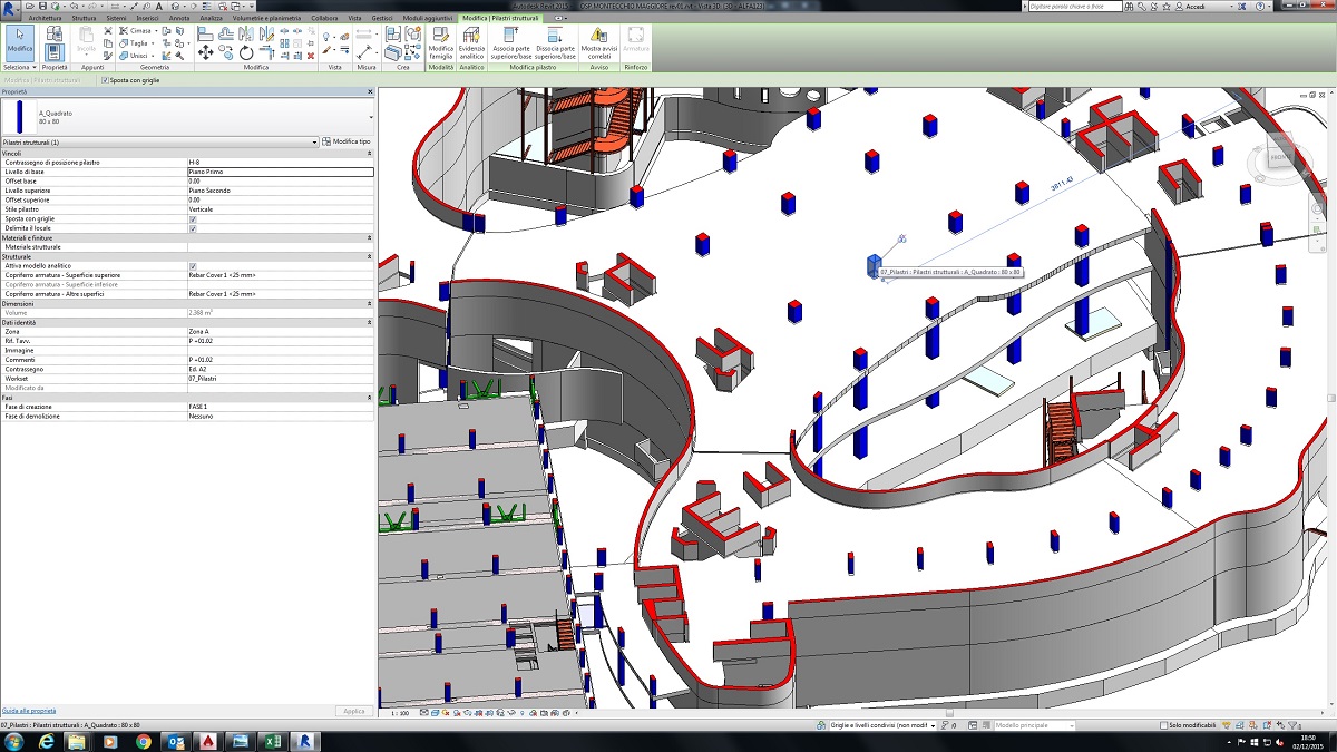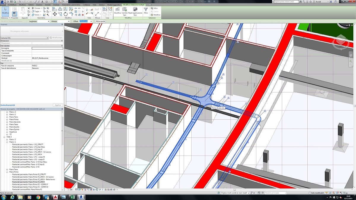 L’attività di modellazione è stata inizialmente sviluppata con la restituzione planivolumetrica del rilievo topografico, parametrizzandolo con la posizione geografica e l’orientamento. Si è proseguito quindi con la modellazione generale delle strutture in cemento armato (solo casseri) e dell’involucro architettonico, con l’inserimento delle partizioni e degli elementi interni. Per gli impianti meccanici, sono state modellate le canalizzazioni di distribuzione aeraulica, le tubazioni dorsali di distribuzione fluidi termo vettori, i terminali in ambiente (diffusione aria, fan coil, le sottocentrali di edificio), Uta, sistemi di pompaggio, solo nella mera volumetria di ingombro.