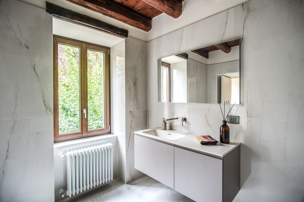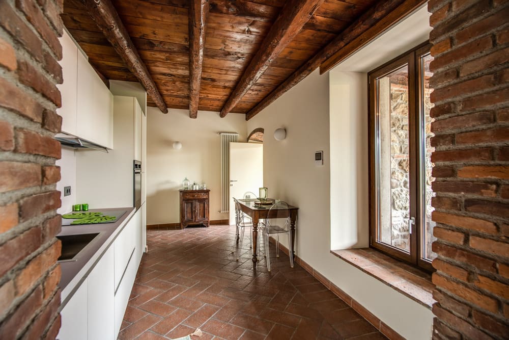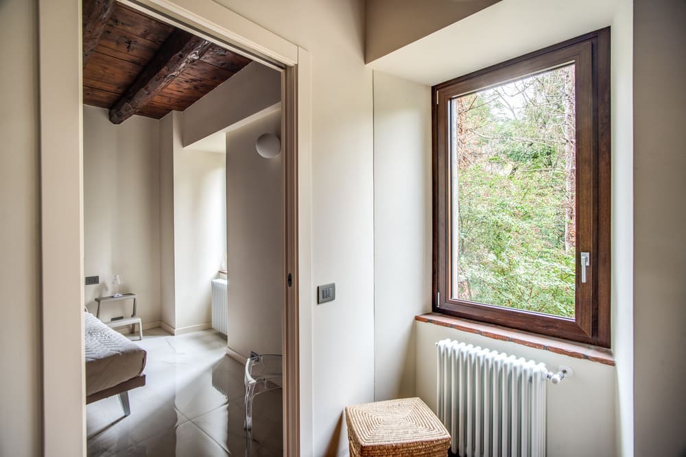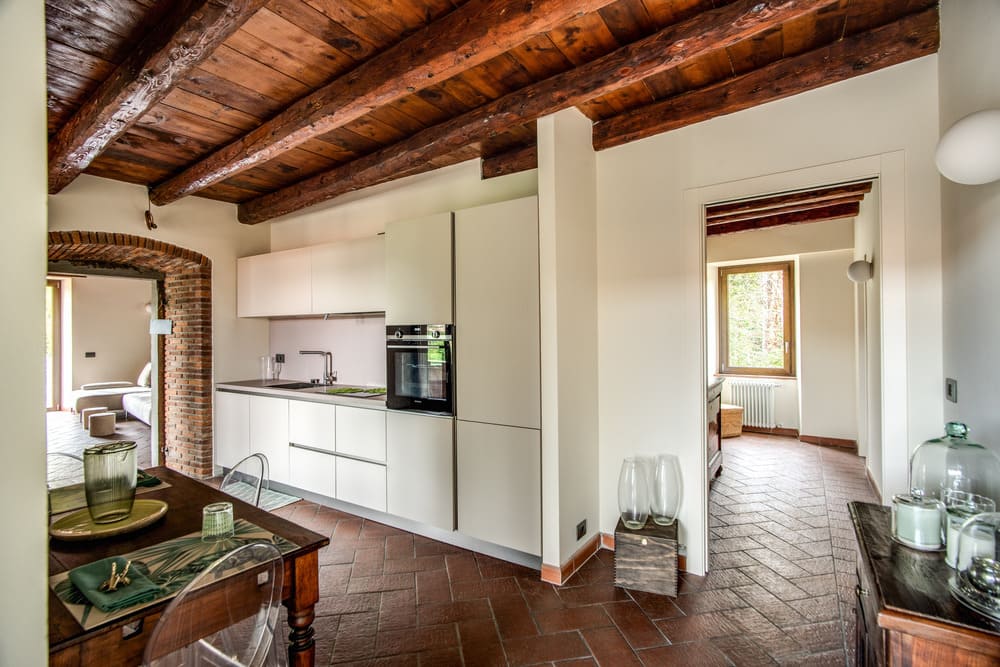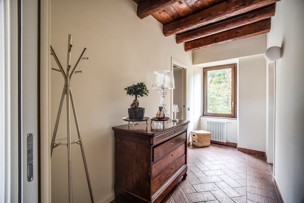 La volontà iniziale del proprietario era di realizzare una ristrutturazione che celebrasse l’equilibrio tra tradizione e modernità, mantenendo molti arredi originari, accostati a nuovi elementi e finiture e materiali come la pietra e il legno. Anche da un punto di vista cromatico, tutto è calibrato con attenzione. La leggera trasparenza di alcuni complementi si mescola con alla solidità del legno; le finiture color noce dei serramenti dialogano con le massicce travi a vista e gli scuri esterni, valorizzando il materiale.