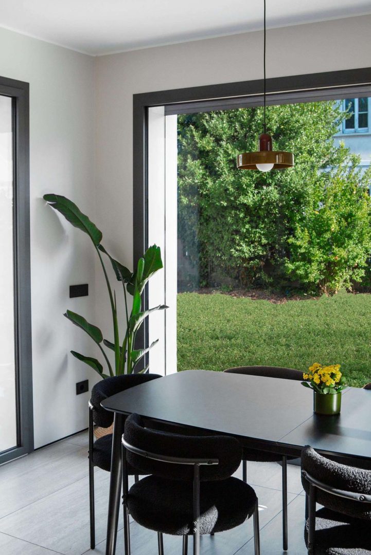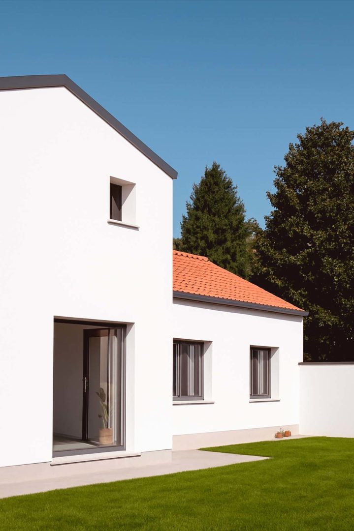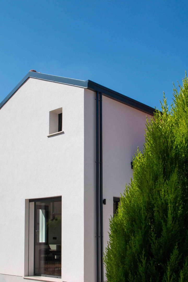 Esternamente, l’alternanza tra l’intonaco bianco e i serramenti in alluminio nero dialoga con il tetto in coppi rossi, richiamando la tradizione costruttiva del territorio in una chiave più essenziale e attuale.