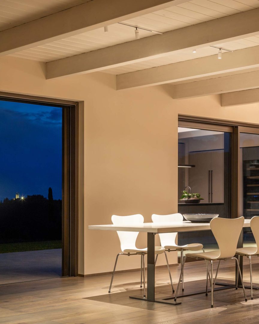 Al primo piano sono stati installati sei sistemi scorrevoli Schüco Ase 51 Pd, scelti per il loro design minimale e la capacità di integrarsi completamente nelle pareti, creando un effetto incorniciato di grande eleganza.