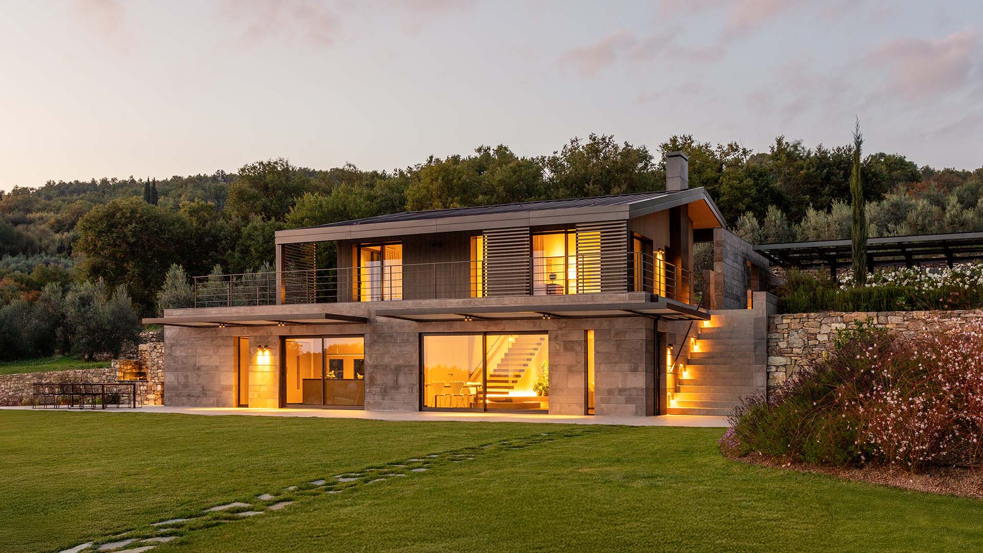 L’intervento si inserisce in un oliveto terrazzato, sfruttando la morfologia naturale del versante: il basamento dialoga con il terreno, mentre il volume del primo piano si solleva, caratterizzato da una copertura metallica e da rivestimenti lignei che ne sottolineano la leggerezza.