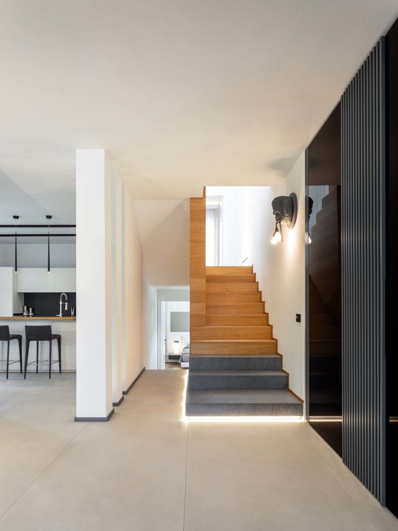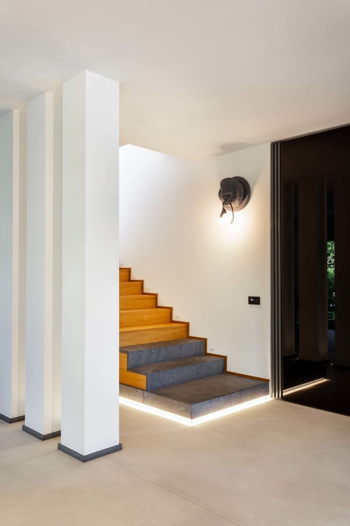 La scala in legno che conduce al piano superiore si distingue come elemento centrale dello spazio, valorizzata da un’illuminazione alla base che ne esalta i profili e ne sottolinea l’eleganza, creando un raffinato gioco di luci e ombre.