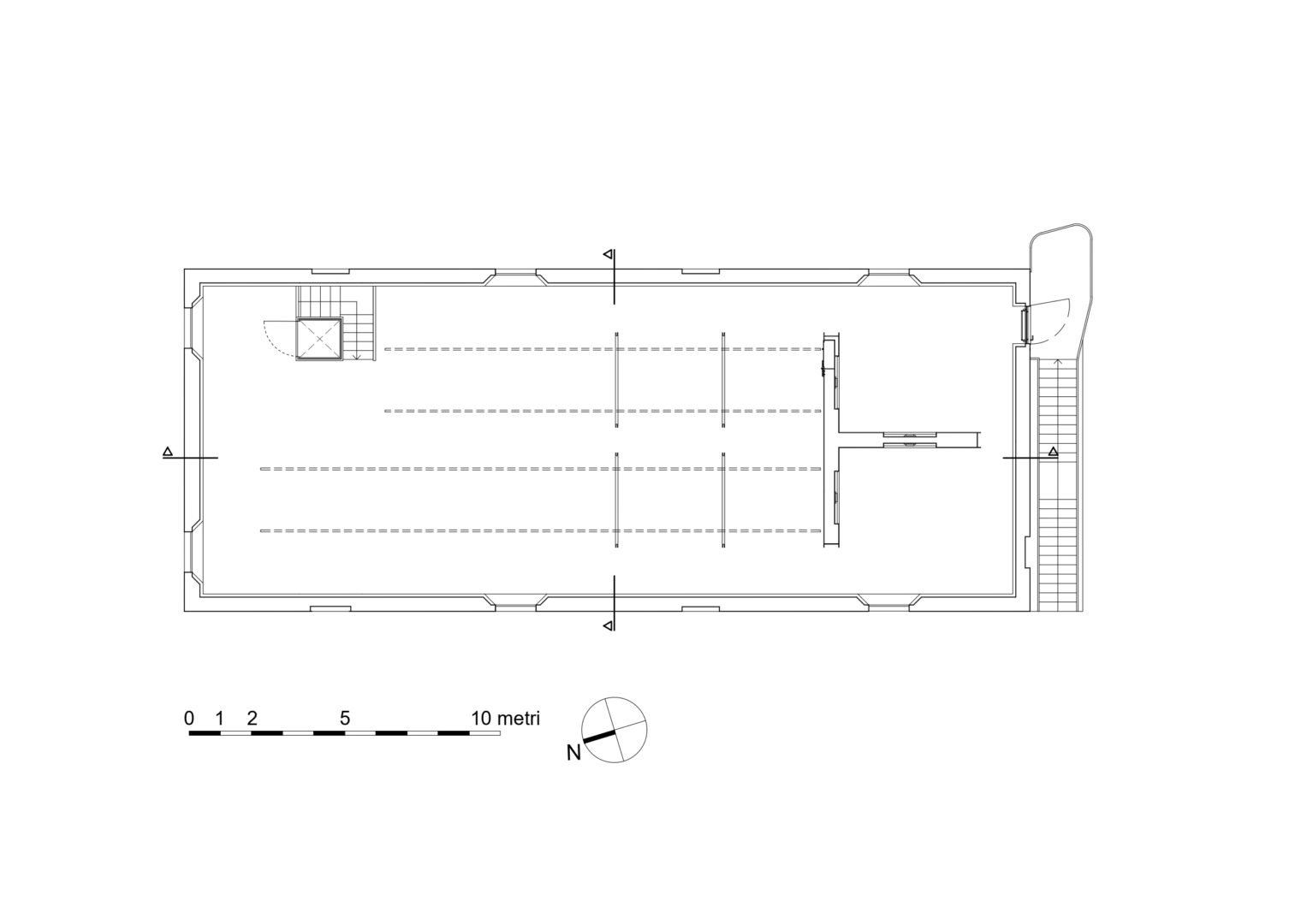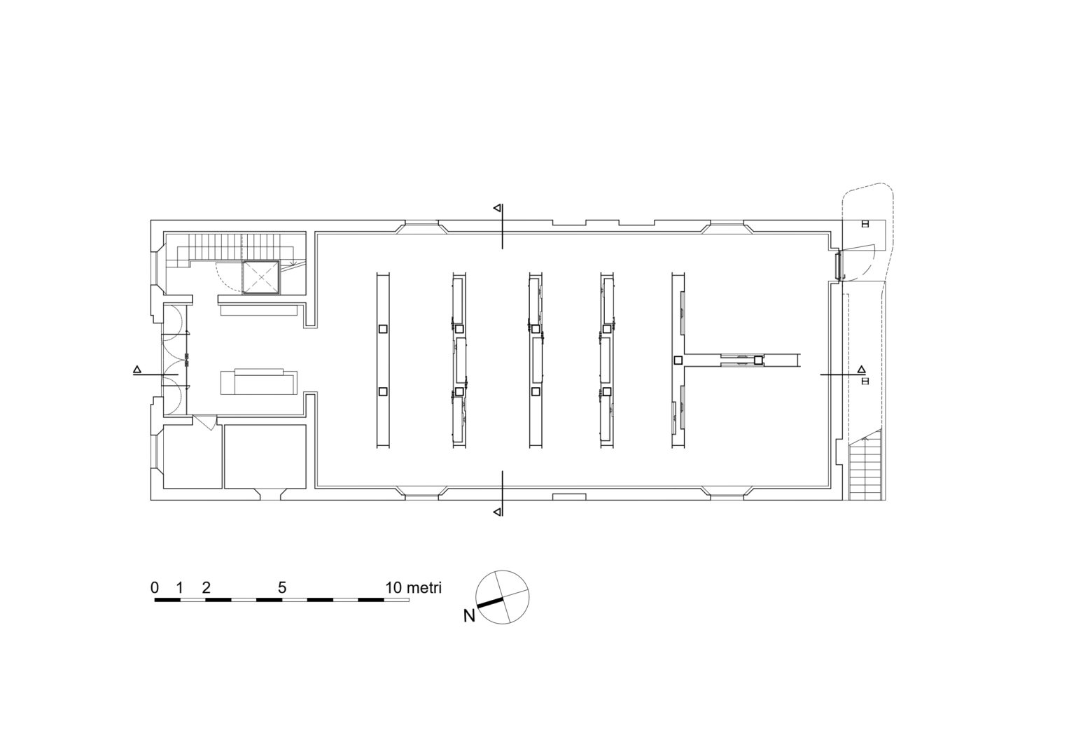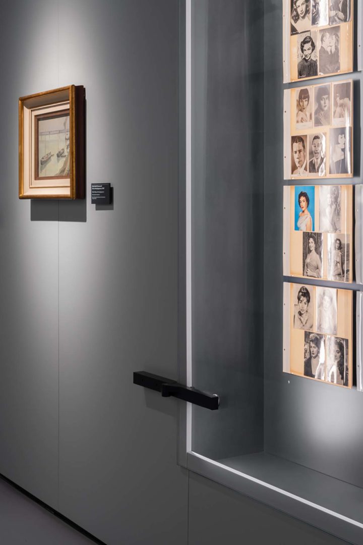 Seguendo la stessa logica del piano inferiore, anche le pannellature mobili del primo piano ospitano delle teche vetrate, e non celano, bensì esaltano i dispositivi meccanici sfruttati per la traslazione e la rotazione a 90°.