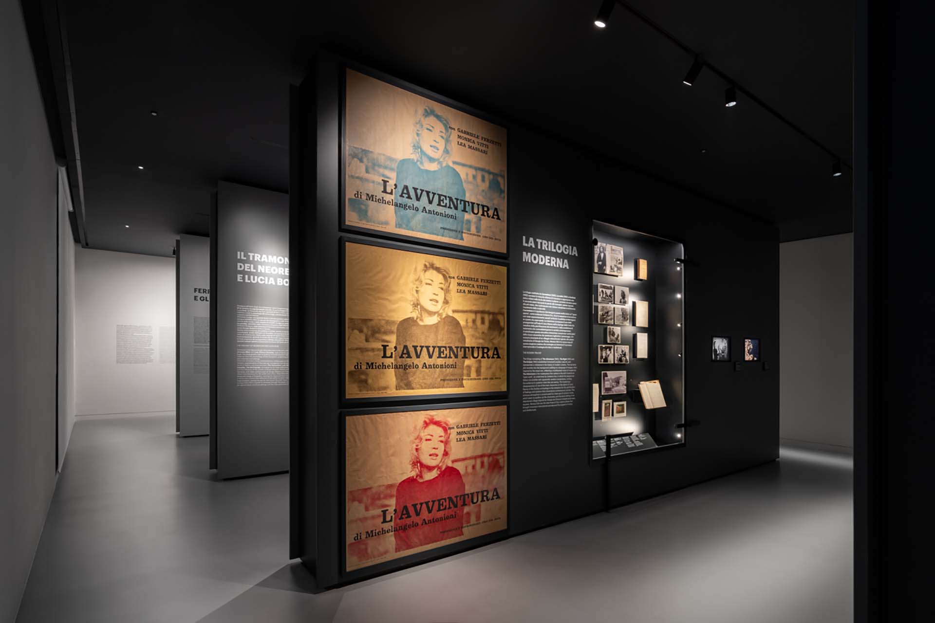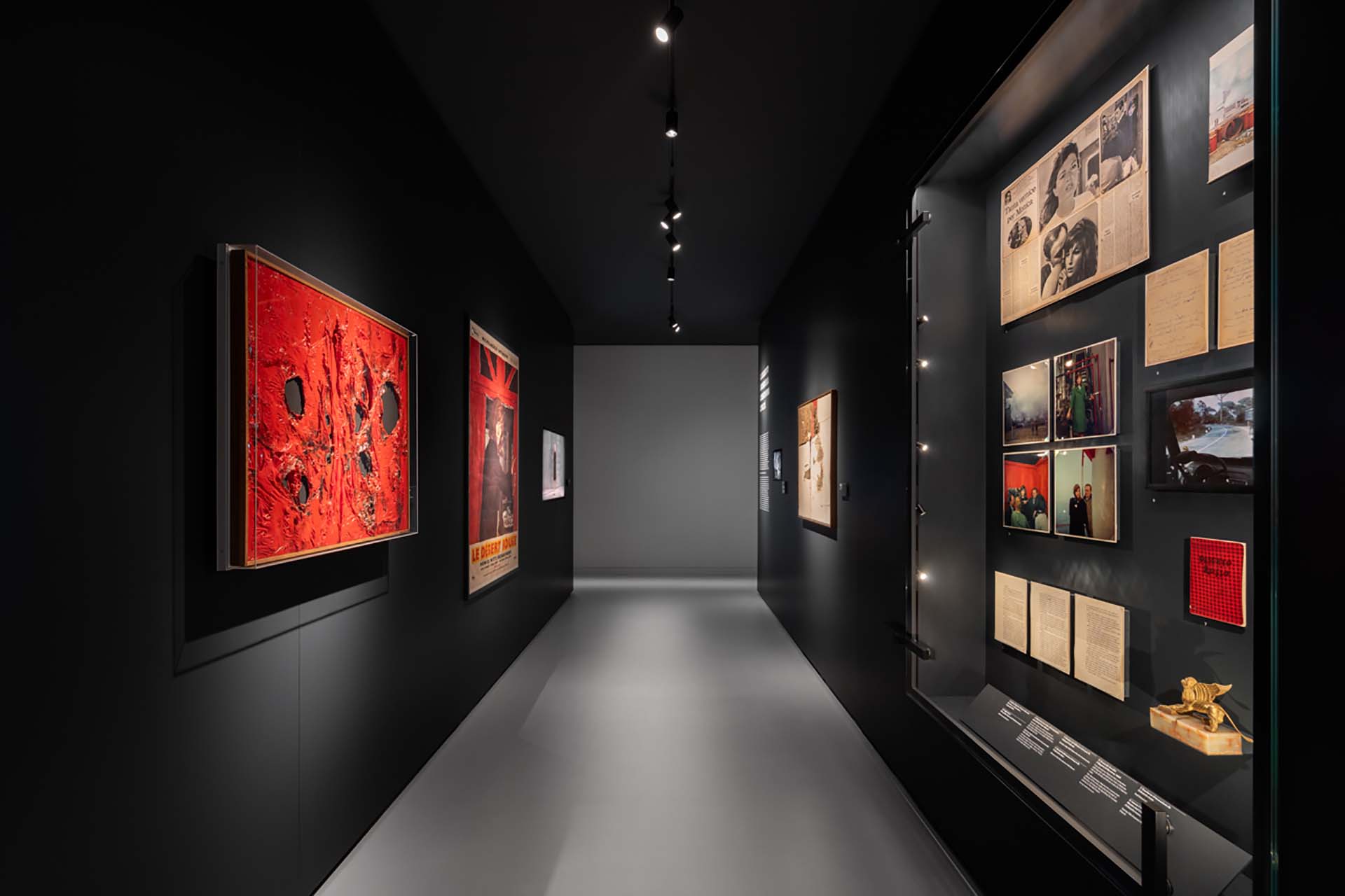 La visita quindi si articola in un percorso espositivo chiaro, fluido e dinamico, che ricorda uno dei piani sequenza di Antonioni. Se al piano terra il ritmo è scandito da cinque setti espositivi monolitici, che raccontano le varie sezioni, il primo piano sorprende per la sua estrema flessibilità. Superato l’ingresso dotato di biglietteria e un piccolo bookshop, ci si immerge nel mondo del regista, spaziando tra le diverse sezioni, dagli anni ferraresi degli esordi a Il deserto rosso.