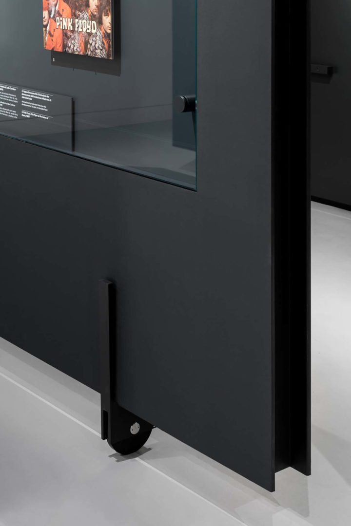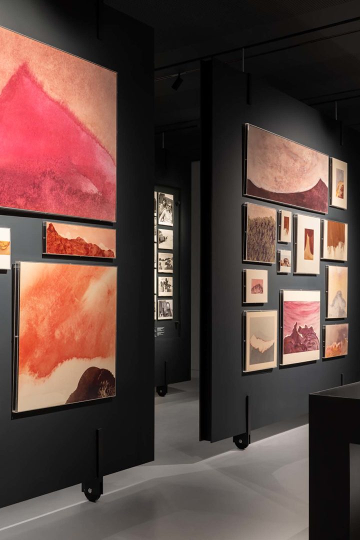 I setti espositivi che ritmano la sala del piano terra, uguali per forma e dimensione, definiscono i diversi ambiti del percorso museale. Inoltre delineano due speciali corridoi visivi laterali. Invece i cinque elementi monolitici mettono in dialogo medium differenti: pareti piene per appendere dipinti e manifesti si alternano a monitor integrati e ad ampie vetrine per l’esposizione di oggetti, documenti e foto.