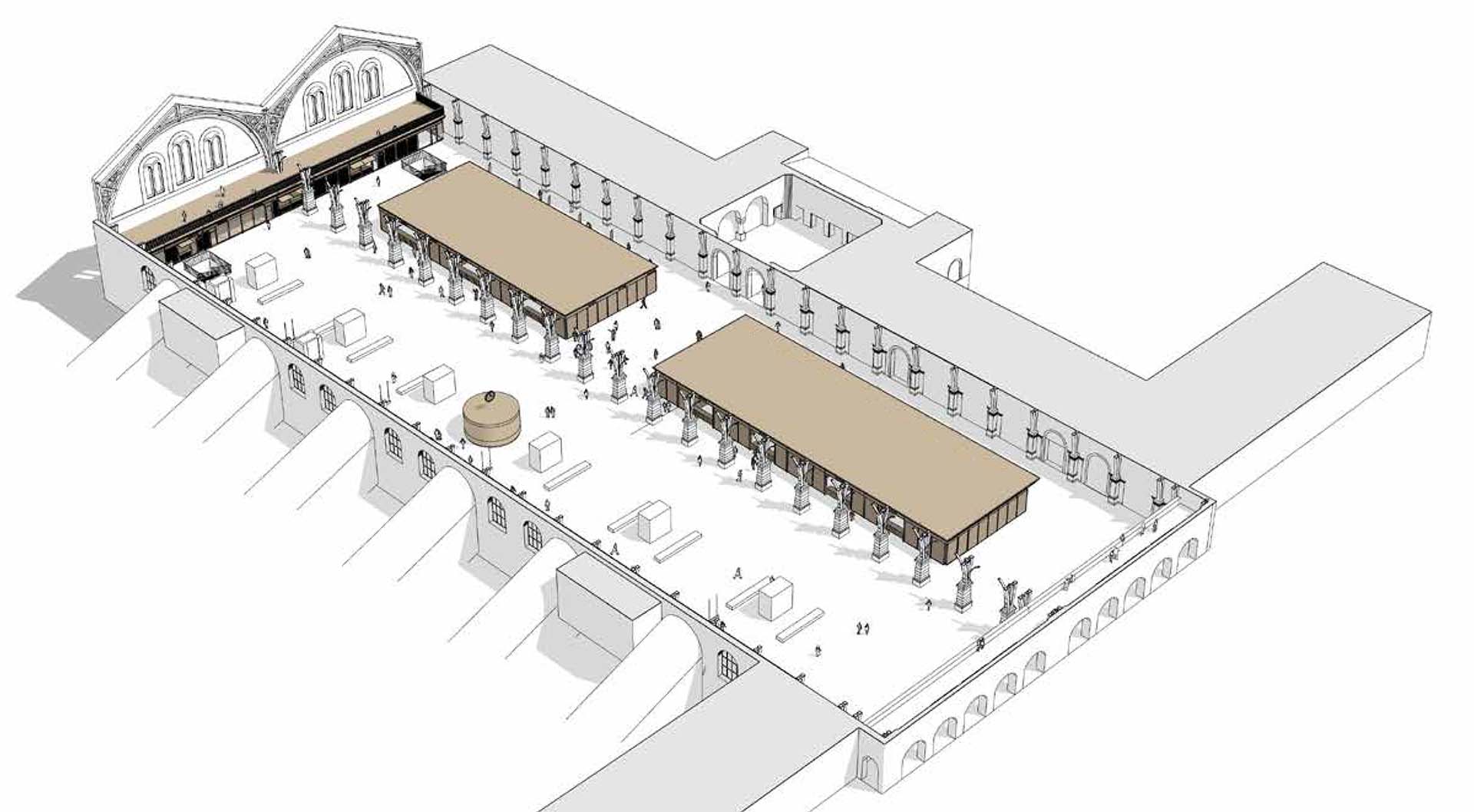 Render della galleria principale. La storia architettonica rivive nelle texture lignee incise con CNC
