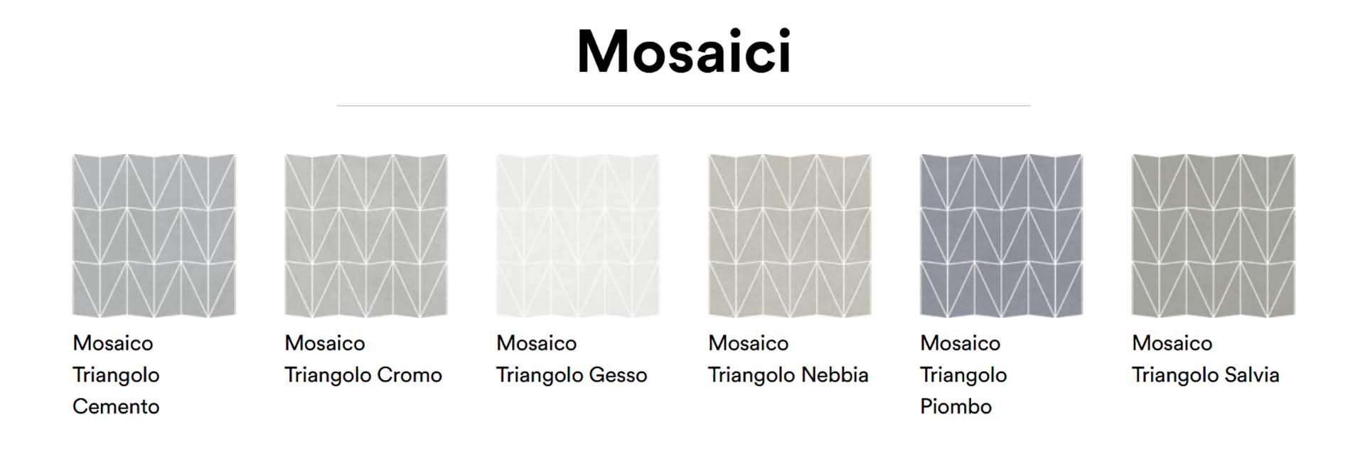 Il pacchetto decorativo arrichisce la collezione con il decoro Trama, che si ispira a una tela dove le trame si intrecciano creando segni astratti, e il mosaico Triangolo dal motivo geometrico.