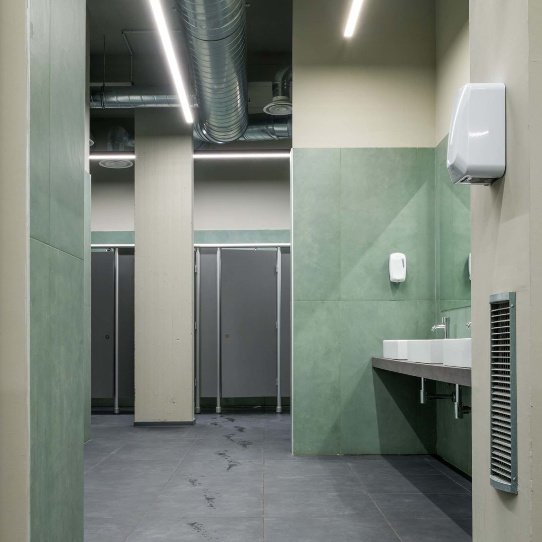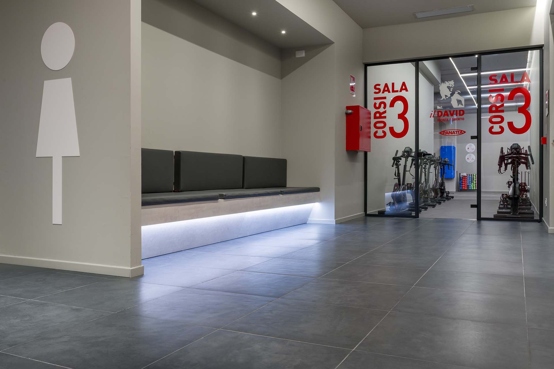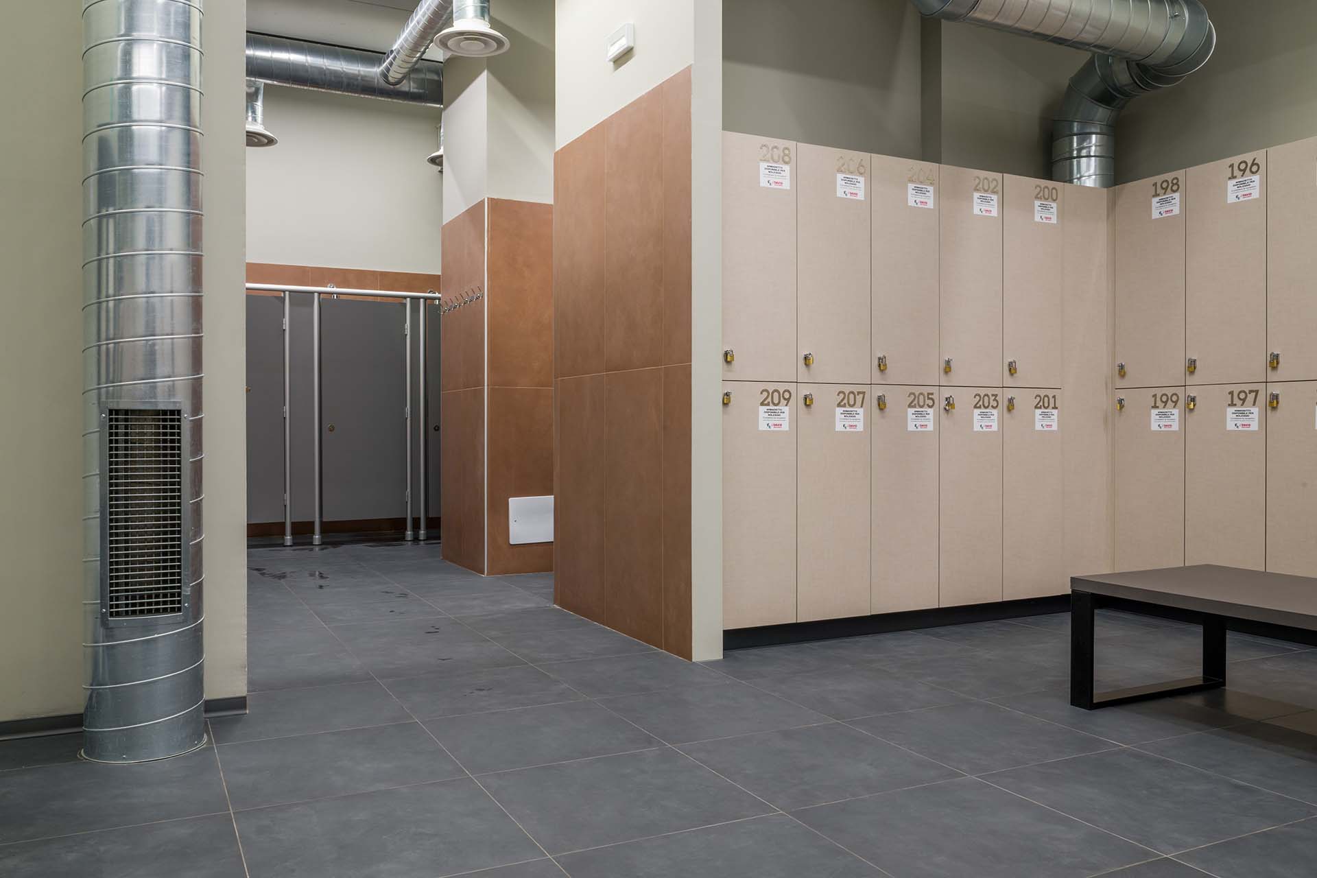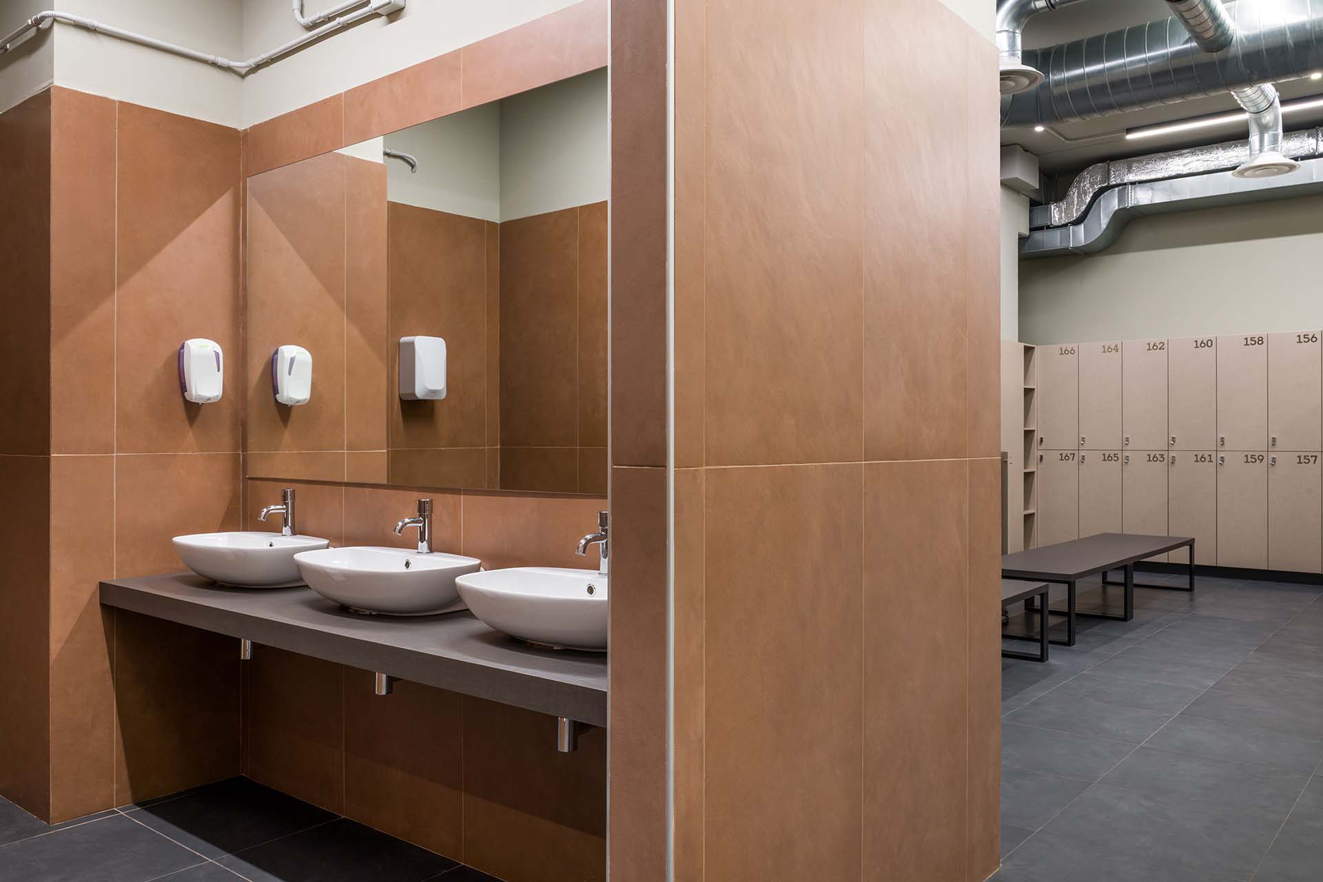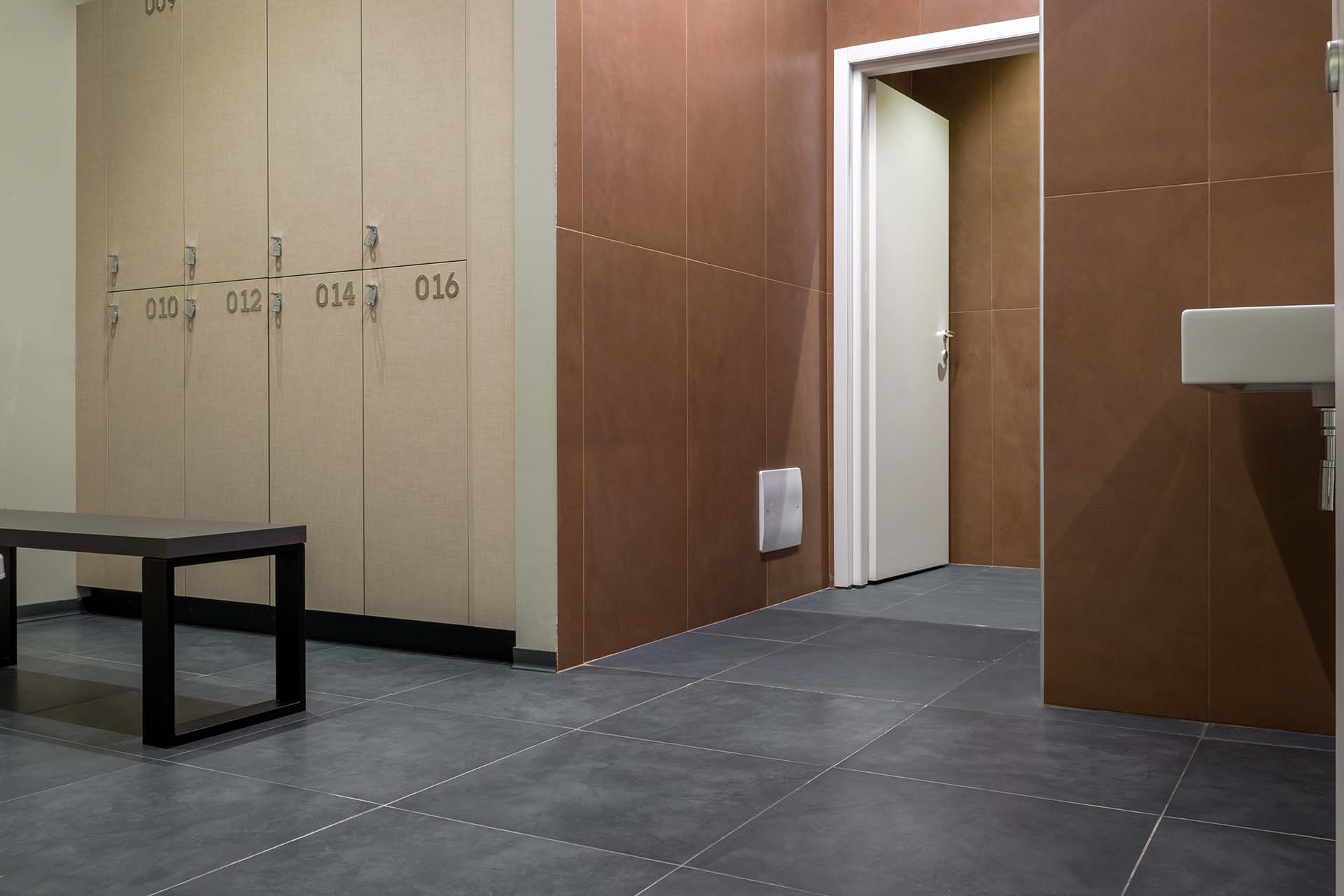 Gli spogliatoi introducono accenti materici e tonali che differenziano gli ambienti senza spezzare l’armonia complessiva: Spice 60×120 Soft per il settore femminile, Verve 60×120 Soft per quello maschile.