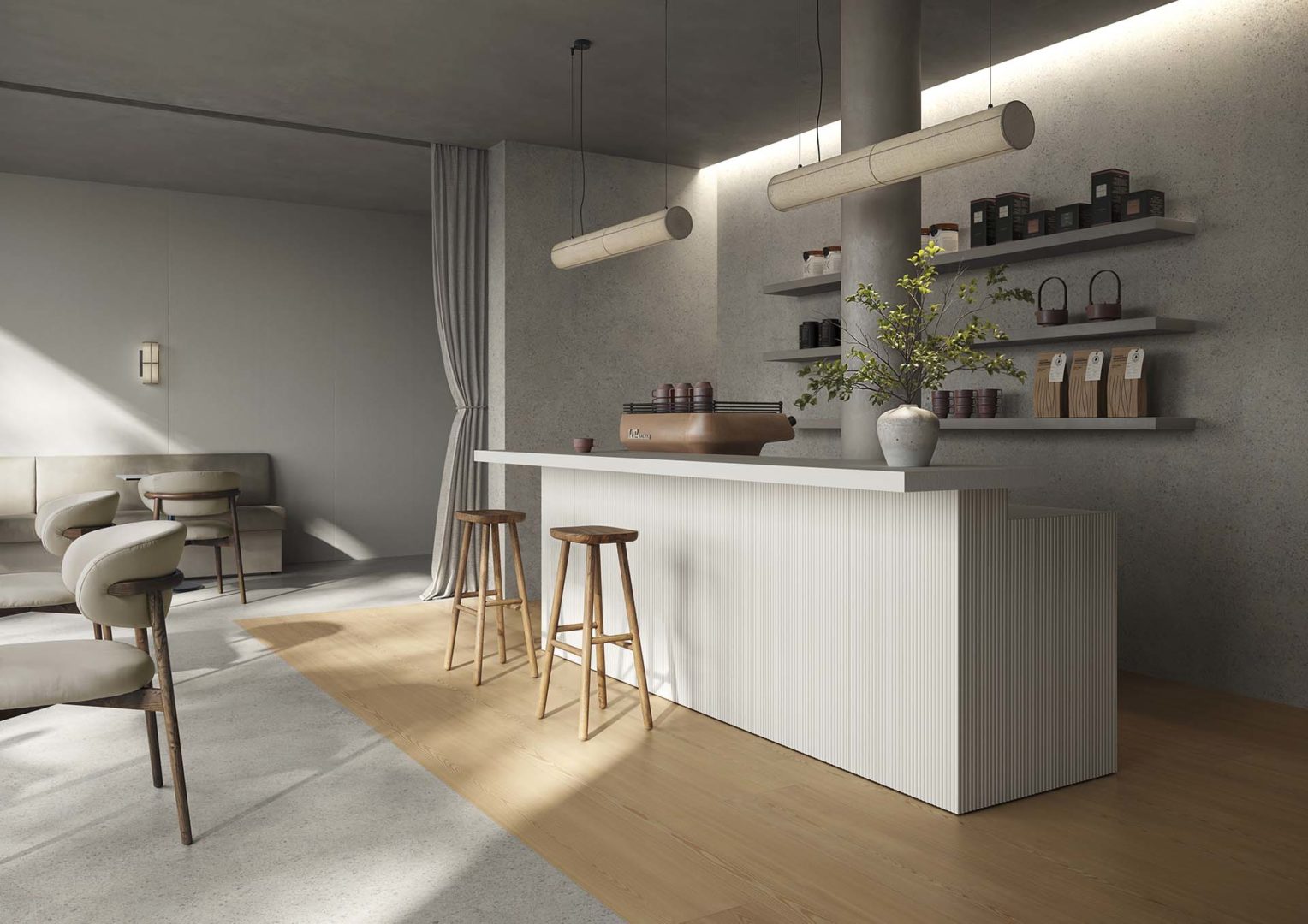 Grazie alla possibilità di fondere tre texture diverse in continuità cromatica o a contrasto, è possibile creare ambienti fluidi oppure definire aree funzionali con eleganza.