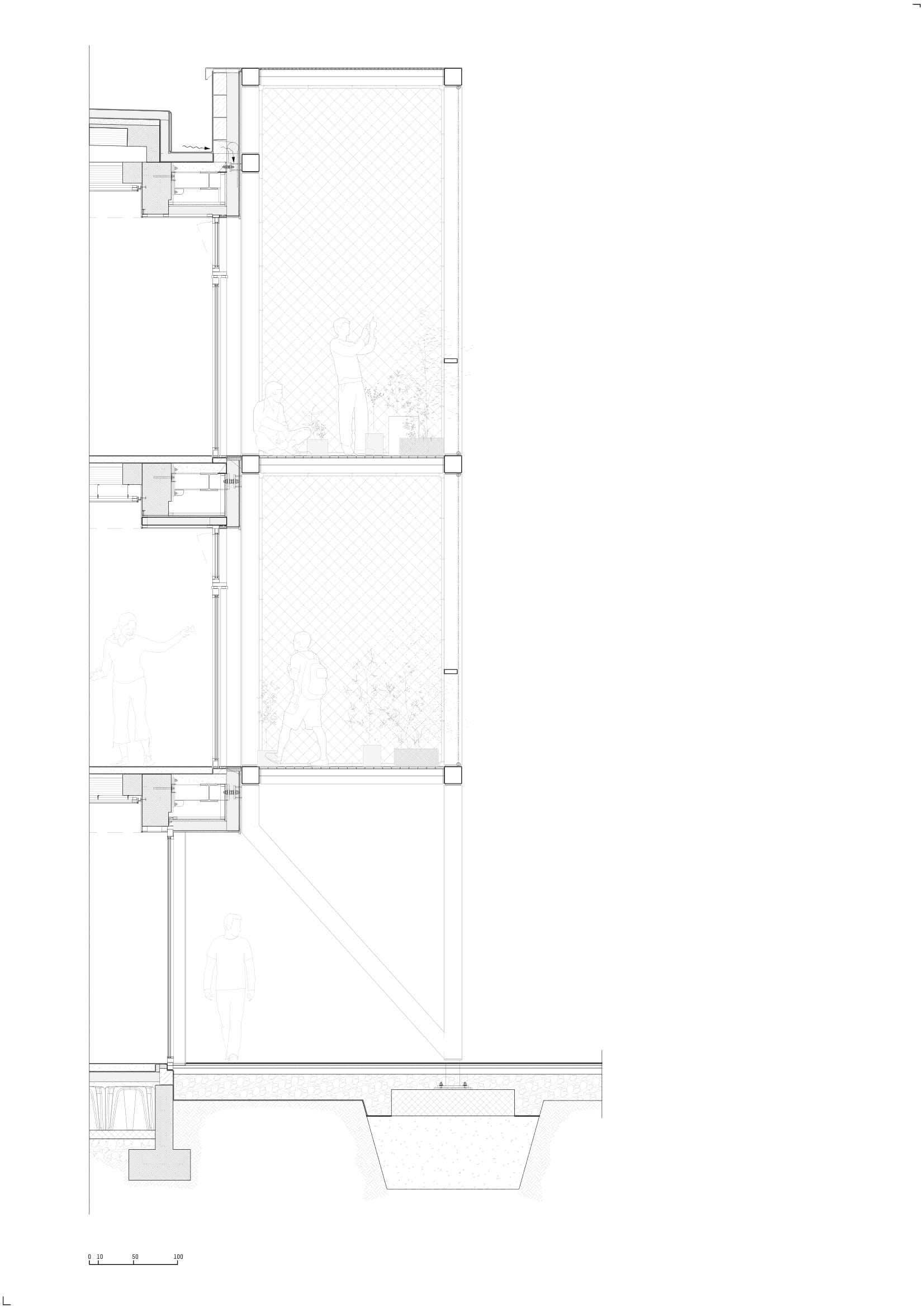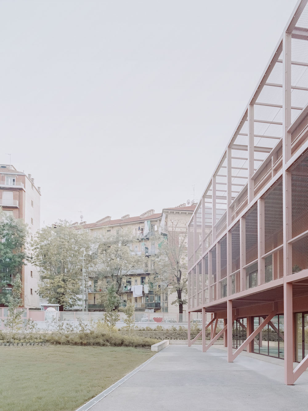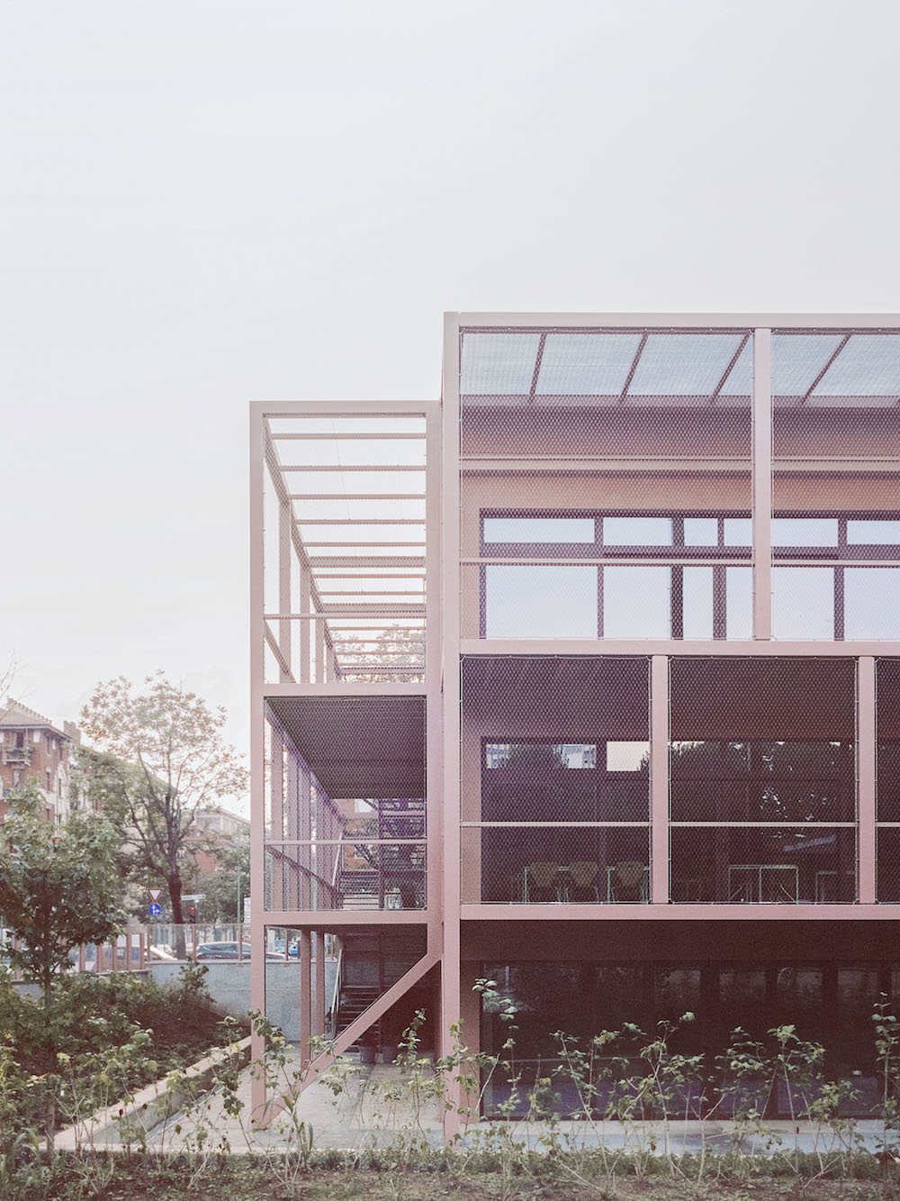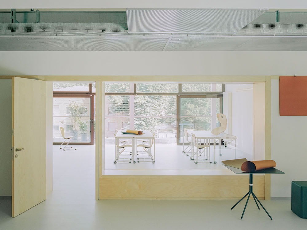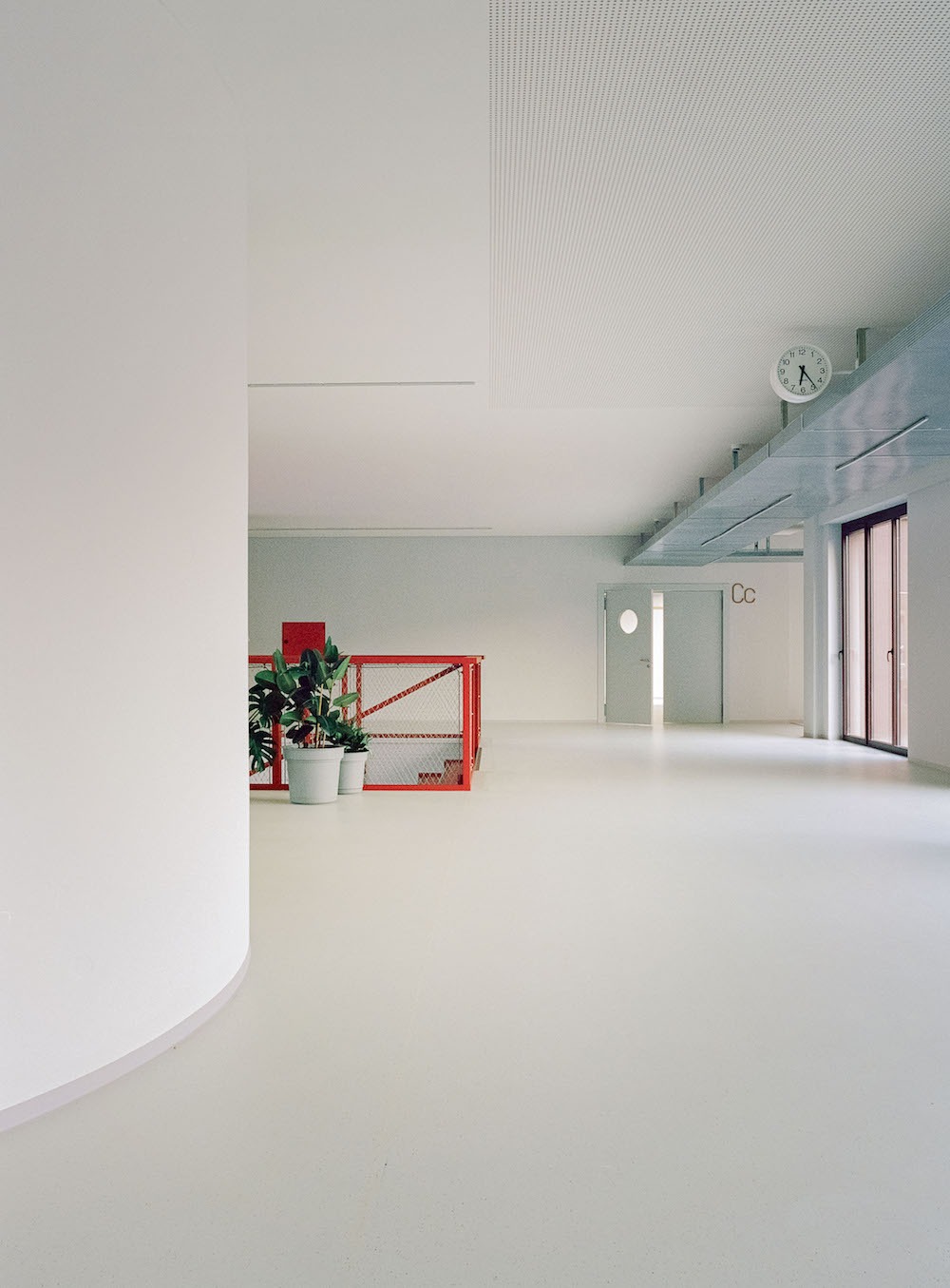 I due piani superiori sono destinati alle attività educative: le classi e i laboratori sono organizzati in cluster, mentre l’atrio diventa spazio di insegnamento informale. Anche le terrazze, che garantiscono una connessione diretta tra aule e cortile, sono concepite come parte integrante della didattica. Queste sono chiuse da una rete metallica, mentre il resto delle facciate si sviluppa alternando ampie vetrate a una muratura trattata con intonaco di granulometria variabile, che genera giochi di diversa profondità.