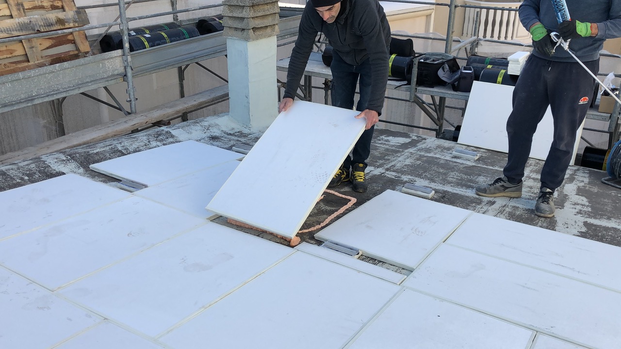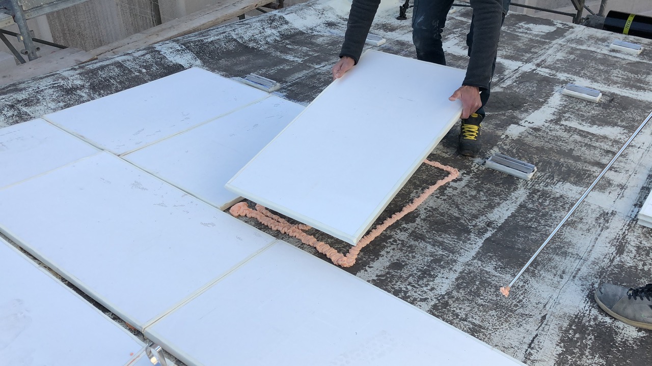 R. Vacunanex Roof permette di raggiungere le resistenze termiche di legge in pochissimo spessore. Viene posato con collante poliuretanico anche su guaine esistenti ammalorate, per poi essere rivestito con una successiva guaina bituminosa direttamente stesa a fiamma diretta, senza dover proteggere l’isolante. Dopodiché è immediatamente calpestabile.