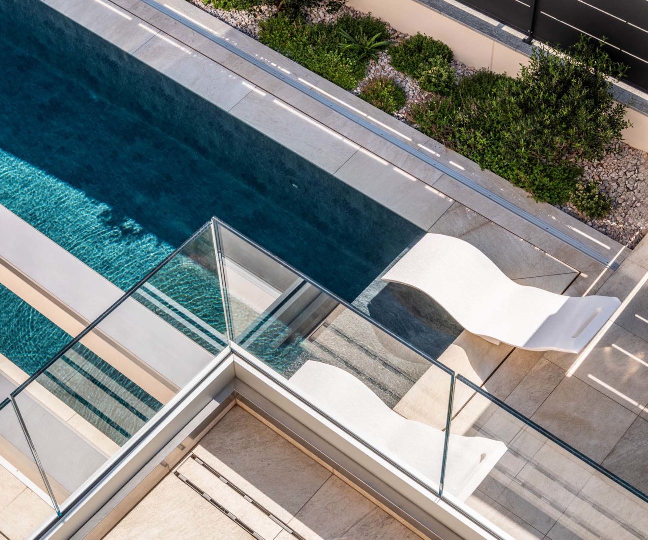 Il secondo piano conduce a un terrazzo pavimentato in teak, affacciato sulla città e sul giardino privato. Una piscina a sfioro e un’illuminazione scenografica completano l’esperienza abitativa, rafforzando il dialogo tra interno ed esterno. Le grandi vetrate, vere e proprie cornici panoramiche, rendono questa continuità naturale e immediata.
