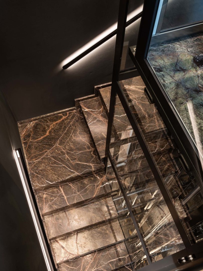 Il collegamento verticale è affidato a una scala scenografica rivestita in marmo Forest, arricchita da un corrimano con doppia illuminazione Led. Un ascensore total glass inserito nel vano scala consente l’accesso diretto al terrazzo.
