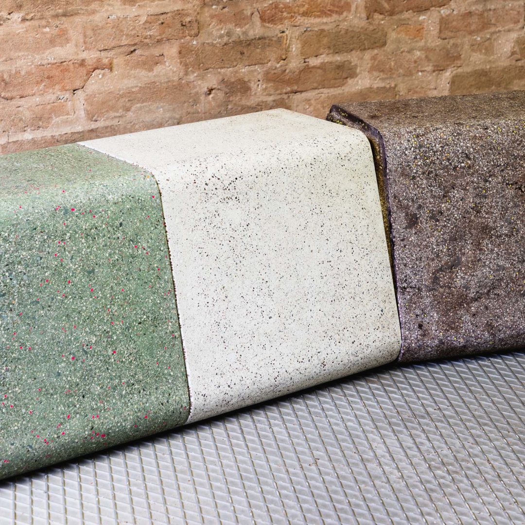 Link è un sistema modulare pensato per essere assemblato in diverse configurazioni, così da creare spazi pubblici flessibili e condivisi. La sua innovazione risiede nel materiale utilizzato: una miscela di cemento e plastica di scarto, che dimostra come i rifiuti possano acquisire nuove qualità estetiche e strutturali.